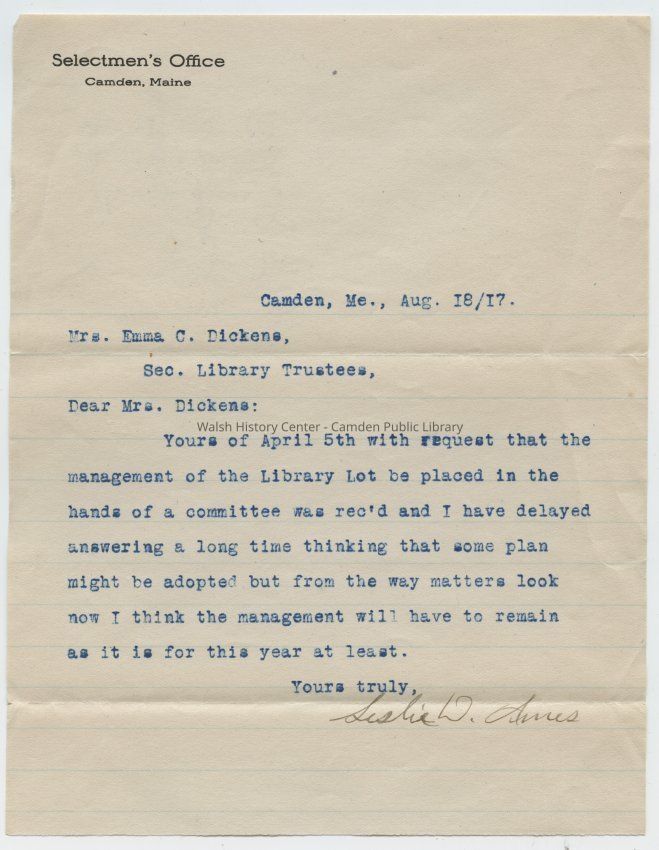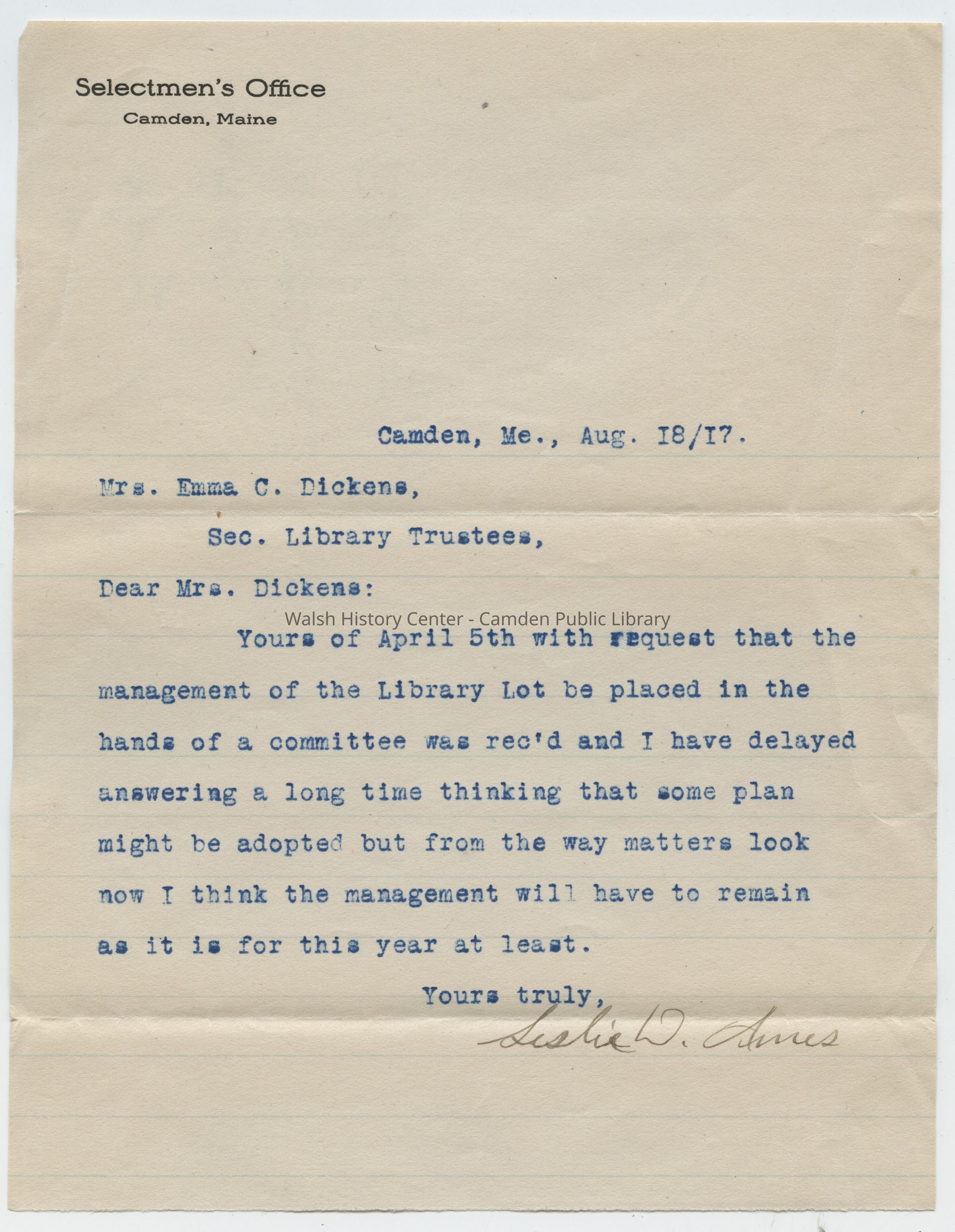 Leslie Ames, Emma C. Dickens, Correspondence, Camden Public Library, SelectmenArchive Details