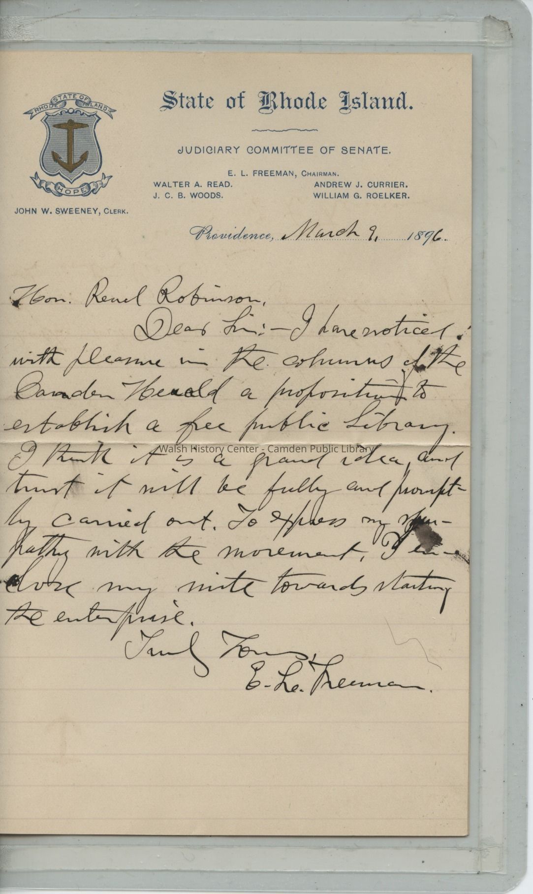A letter addressed to Reuel Robinson from E.L. Freeman, Chairman of the Judiciary Committee of Senate, State of Rhode Island. The letter is written on lined and embossed stationery of the State of Rhode Island.