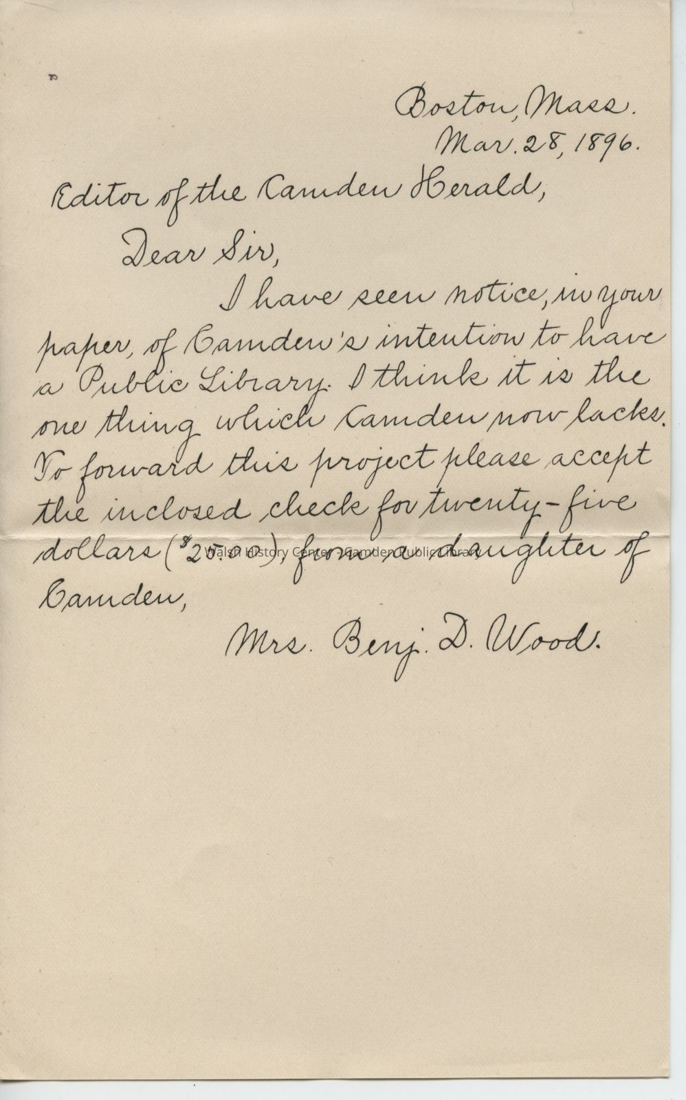 I have seen notice, in your paper, of Camden's intention to have a Public Library. I think it is the one thing which Camden now lacks. To forward this project please accept the inclosed[sic] check for twenty-five dollars ($25.00) from a daughter of Camden.
