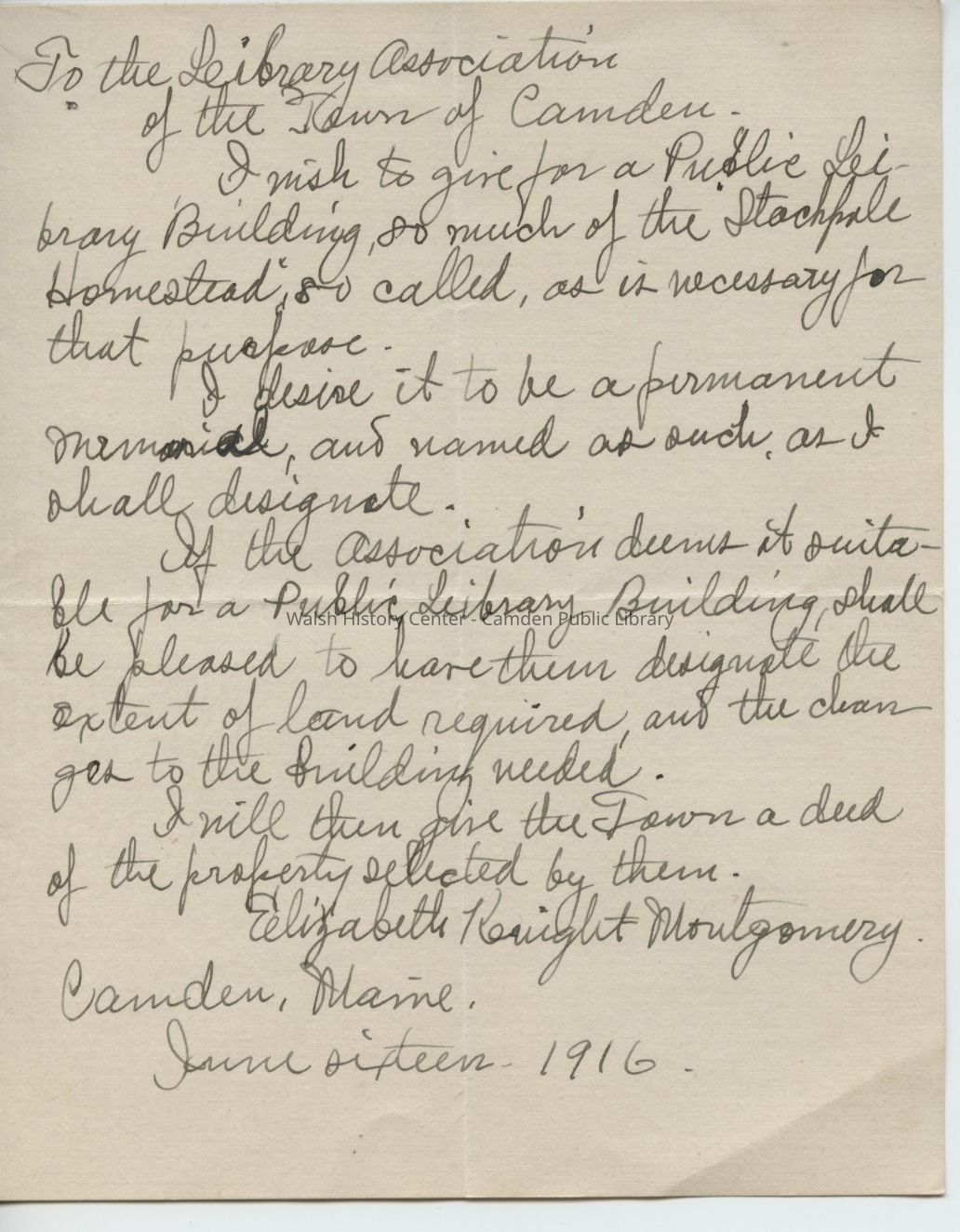 A letter to the Library Association in Camden, Maine, from Elizabeth Knight Montgomery, offering the use of the Stackpole Homestead for a library building.