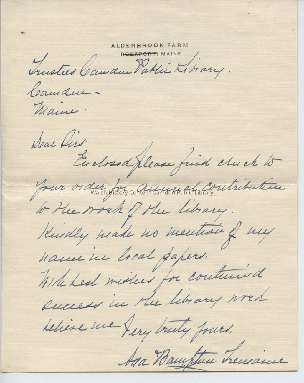 A letter and envelope from Ada Bampton Tremaine to the Trustees of the Camden Public Library, regarding a donation. The letter is undated and the postmark is illegible, but Tremaine had a cottage in Rockport from about 1906 or 1907, and her post office box in Rockland is listed in directories during the 1920's. She died in Rockport in 1928.