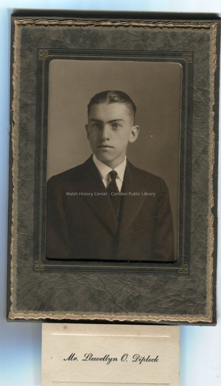 Photograph of Llewellyn O. Diplock, member of the Camden High School class of 1926. Photograph is sepia tinted and enclosed in a decorative cardboard enclosure.Collection