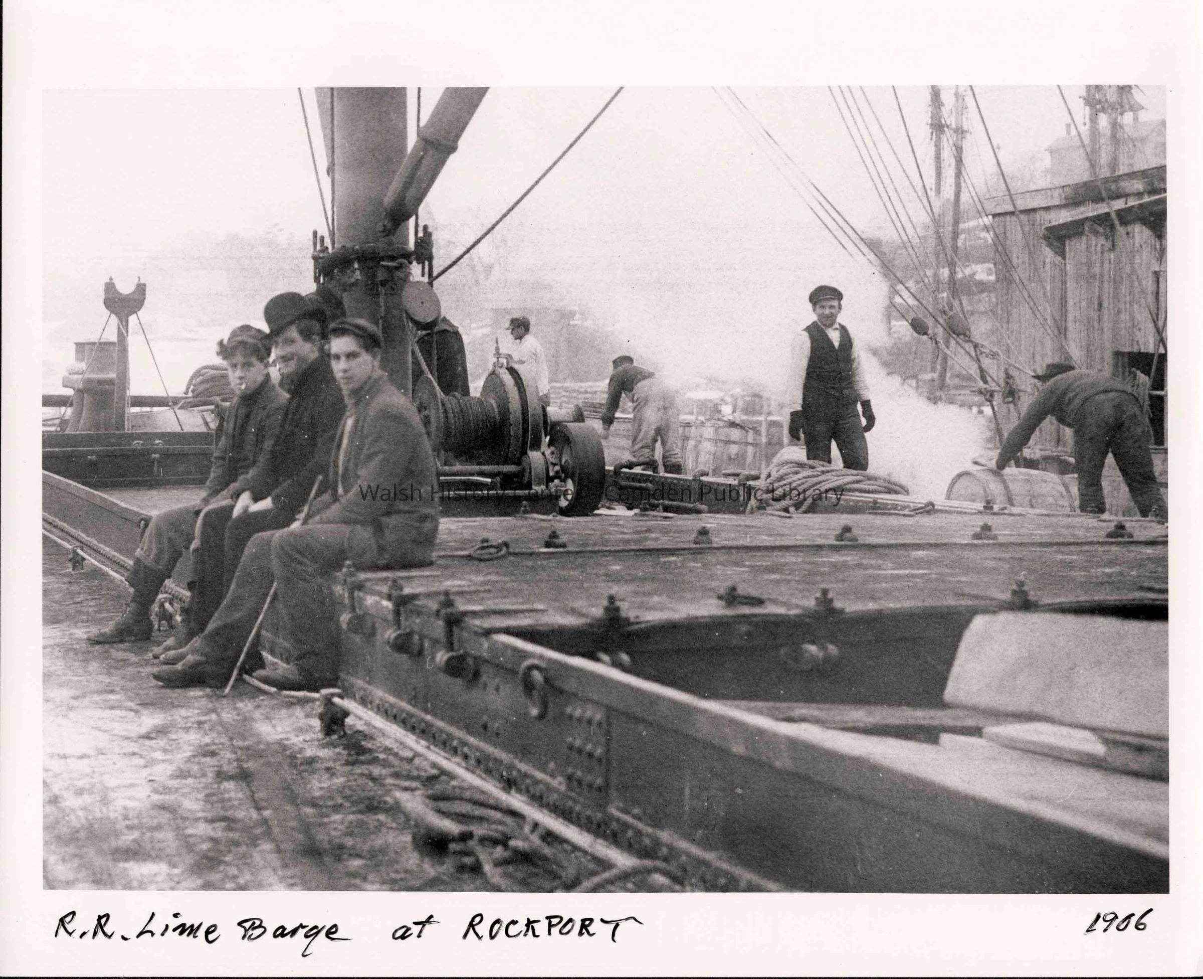 Loading casks of lime onto a barge at Rockport circa 1906.Collection