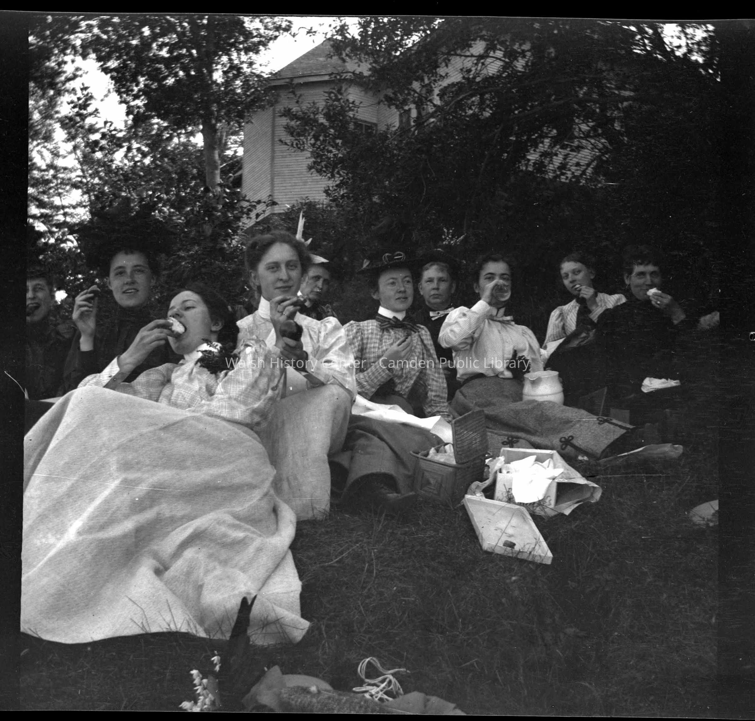 B/W photograph of ten women eating lunch under the trees. Photo is described by the photographer as "a buckboard ride to Northport and Belfast, 20 August 1898."Collection