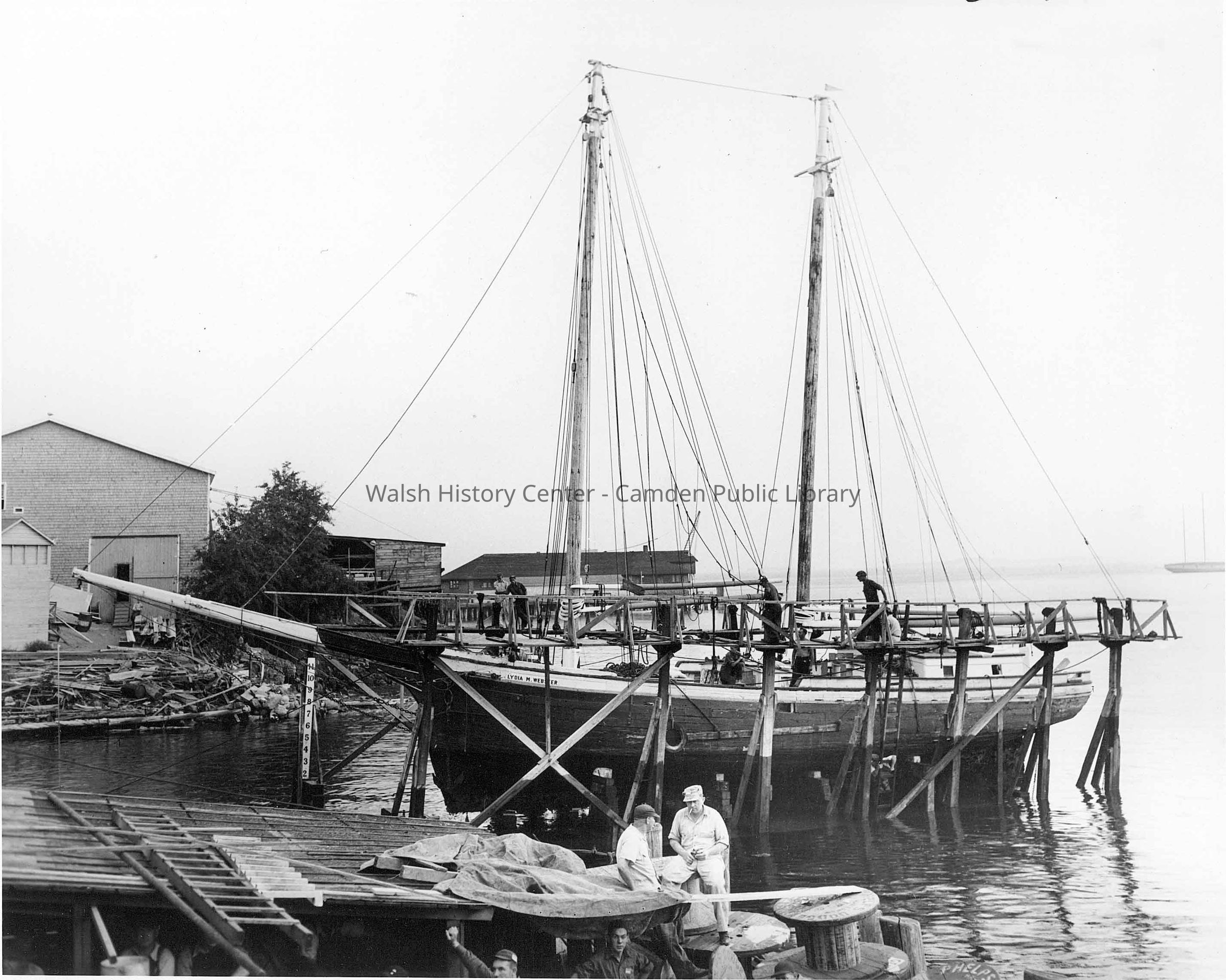 Schooner "Lydia M. Webster" in Camden harbor for repairs circa 1924. The vessel was built at Castine, ME in 1882, 47.76 tons, 58.5' x 21.2' x 6.1'. Home port St. George, ME. Official #140539Collection