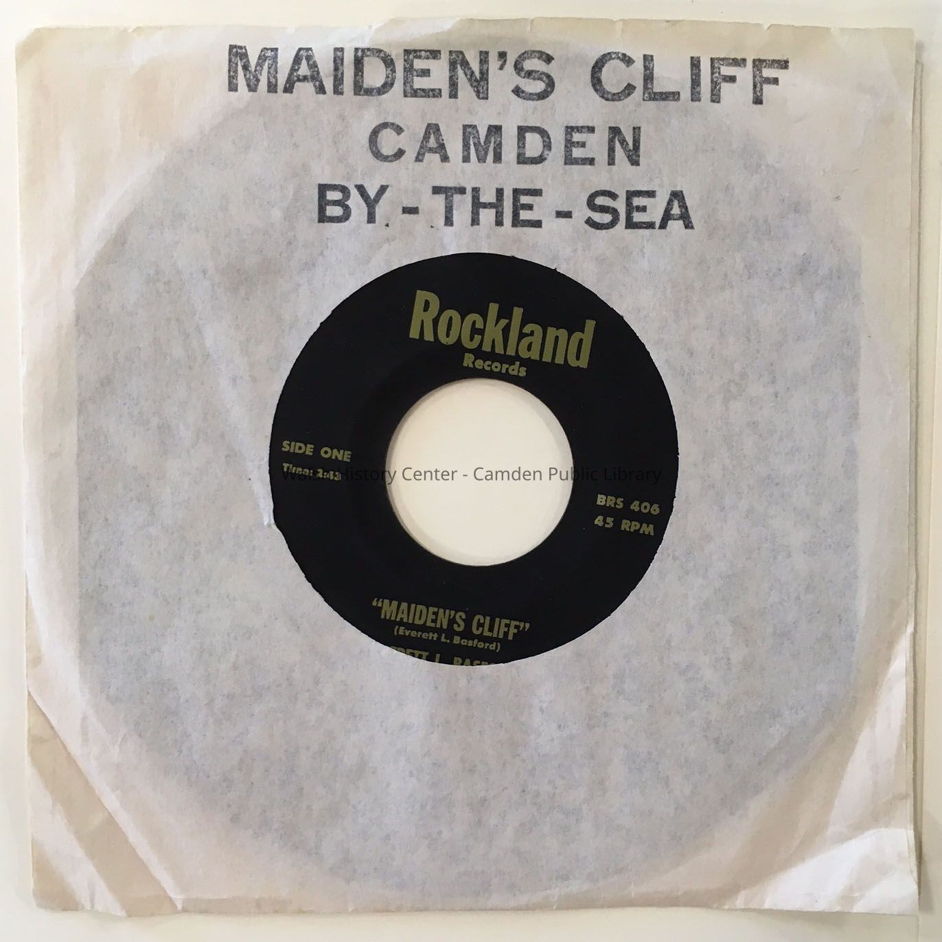 45 RPM record of Everett Basford's "Maiden's Cliff (side 1) and "Camden by the Sea" (side 2). Produced by Rockland Records.Collection