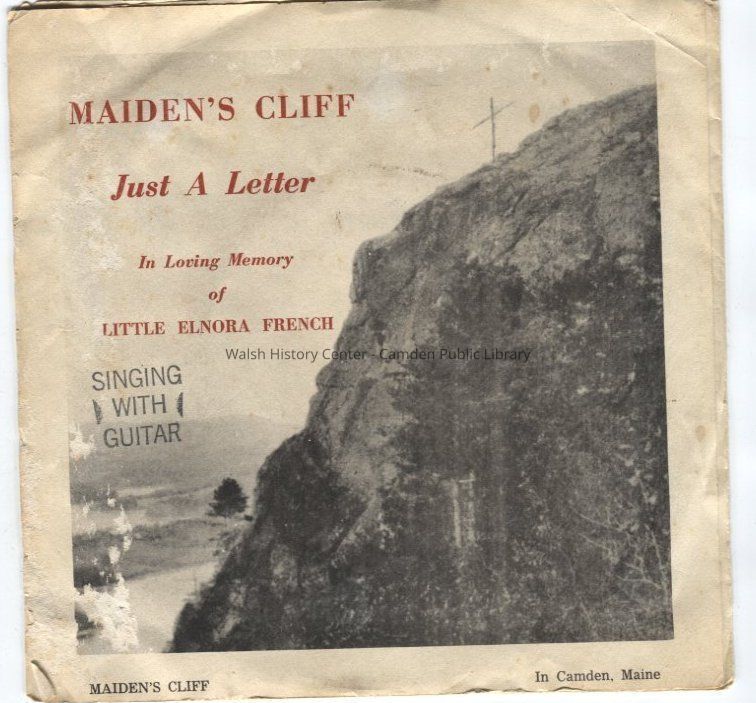 One 45-RPM phonograph record of Everett Basford singing with guitar. Side A is titled "Just a Letter" and Side B is titled "Maiden's Cliff." The envelope is illustrated with a picture of the cross on Maiden's Cliff by Megunticook Lake in Camden, Maine.Collection