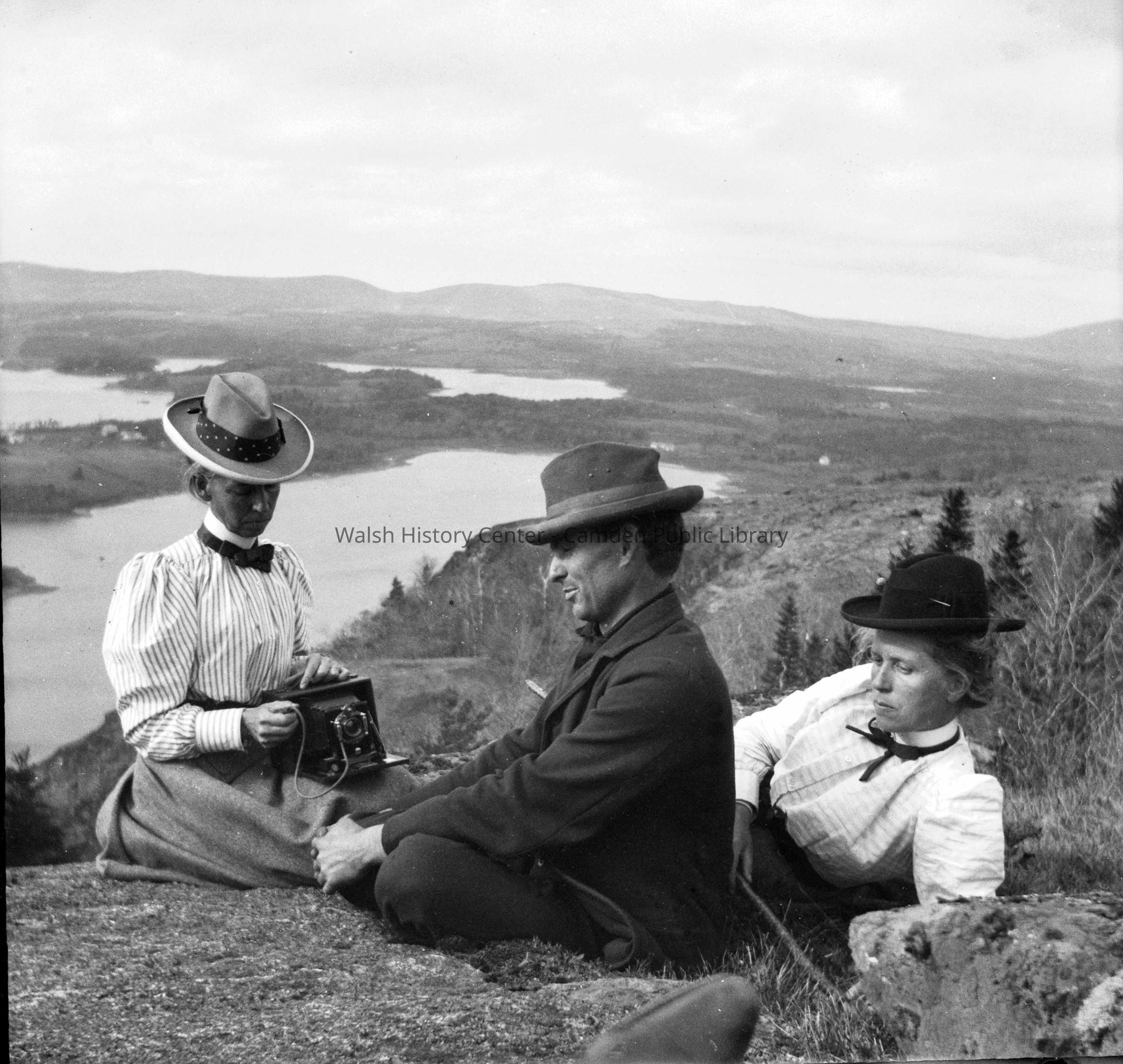 Group seated on Maiden's Cliff in Camden, Maine in October 1899. The two women are identified as Fannie and Lillie.Collection
