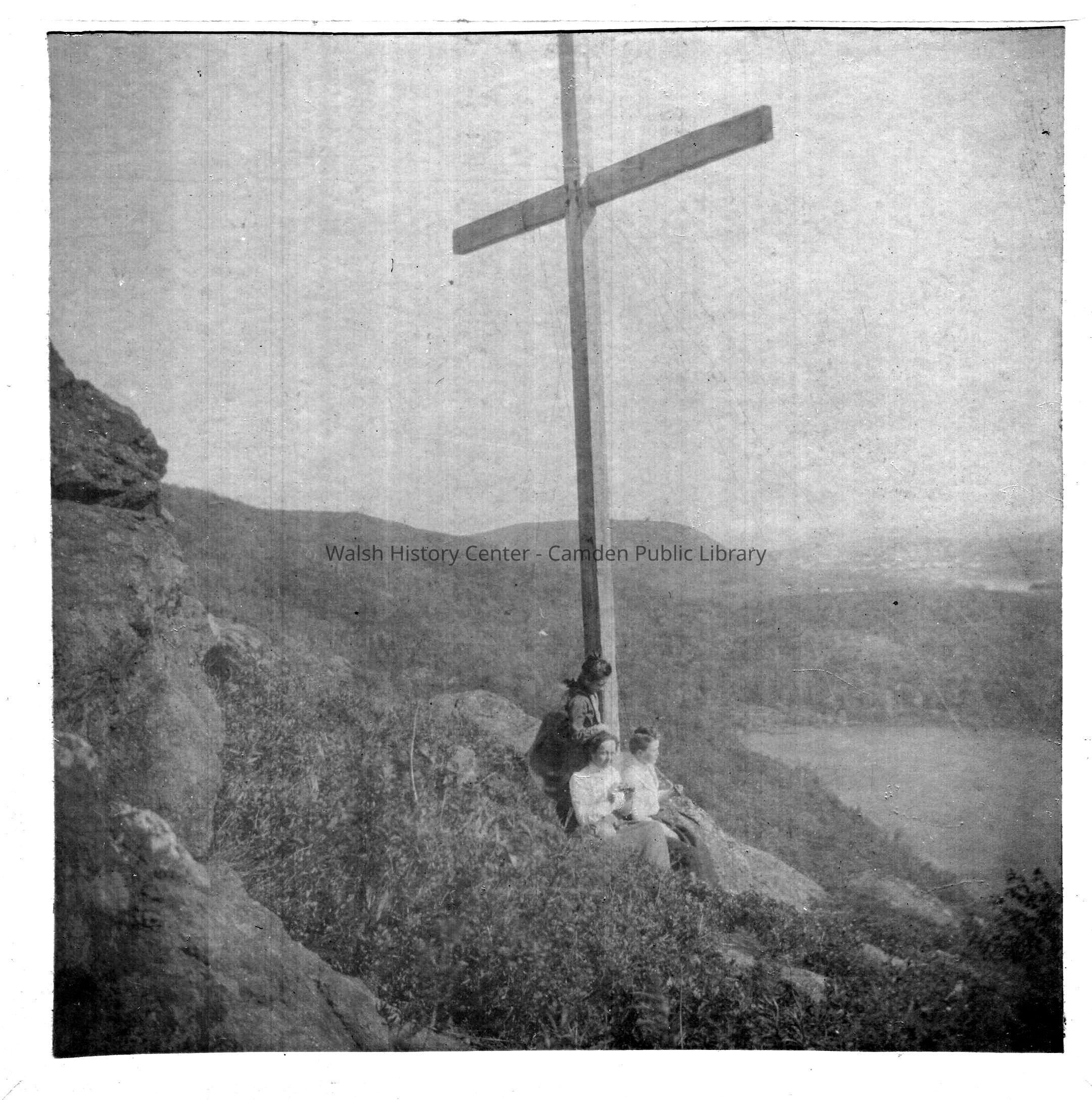 Maiden's Cliff with wooden cross and three women. A building is visible on Mt. Battie in the background.Collection