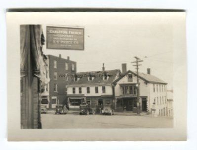 Small black and white photograph of Main Street, Camden. The Perry building shows fire damage along the roofline. Dougherty's store is to the right. A sign on the corner of the street advertises Carleton-French & Co., which is now French & Brawn market.Collection
