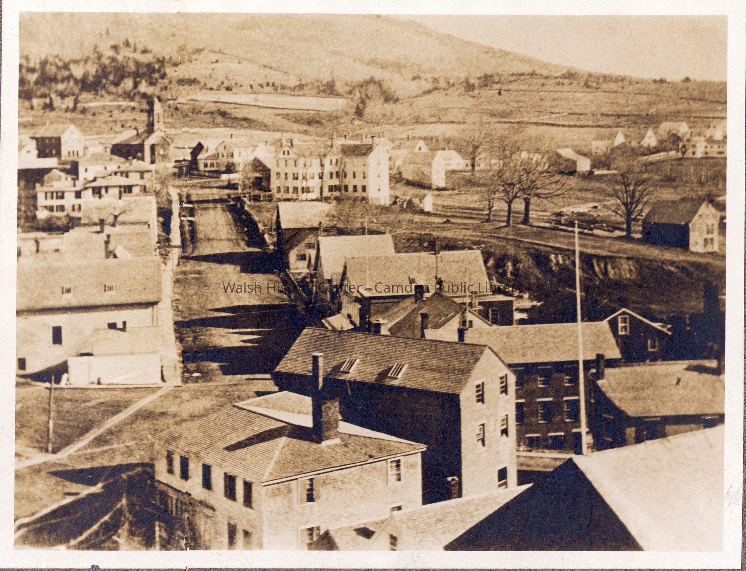 Main Street, Camden, Maine looking north prior to the 1892 fire that burned most of downtown Camden. The Episcopal Church is visible in upper left of picture. The photo was taken from the Chestnut Street Baptist Church steeple. Likely taken around 1871.Collection