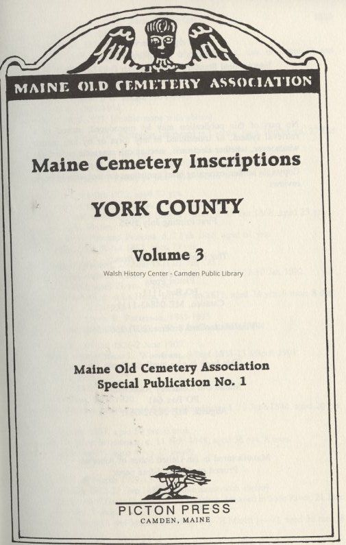 Inscriptions from cemeteries in York County, Maine including the towns of Kennebunk, Kennebunkport, Kittery, Limerick, Limington, Lyman-Dayton, Newfield, Ogunquit, Parsonsfield, and Saco.