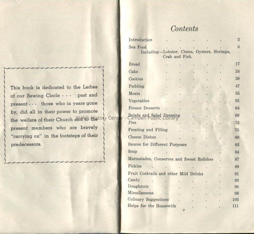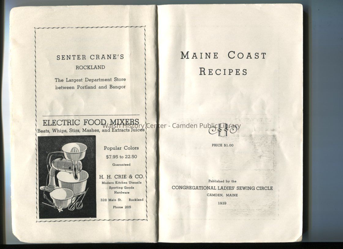 A selection of family recipes from the members of the Congregational Ladies' Sewing Circle in Camden, Maine. Includes "Culinary Suggestions" and "Helps for the Housewife," as well as numerous ads from local businesses.