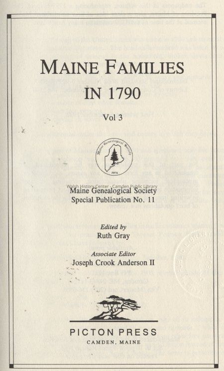 Includes additional families as well as additions and revisions to the families prevsiously published. Head of household was listed by name and the total number of persons living in that household were broken down further. Indian tribe members were not included in the census. Maine was part of Massachusetts in 1790 and included five counties. An every name index includes references to 16, 000 persons. Also includes listing of counties and towns from which the census was taken. In the introduction, one will find a listing of Maine newspapers cited with their location and the date of first issue.