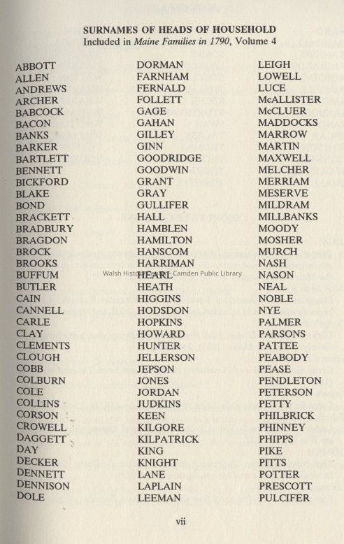 Continued revisions and additons to families of the 1790 census living in Maine. Head of household was listed by name and the total number of persons living in that household were broken down further. Indian tribe members were not included in the census. Maine was part of Massachusetts in 1790 and included five counties. An every name index included. In the introduction, there is a listing of surnames of heads of households for this volume.
