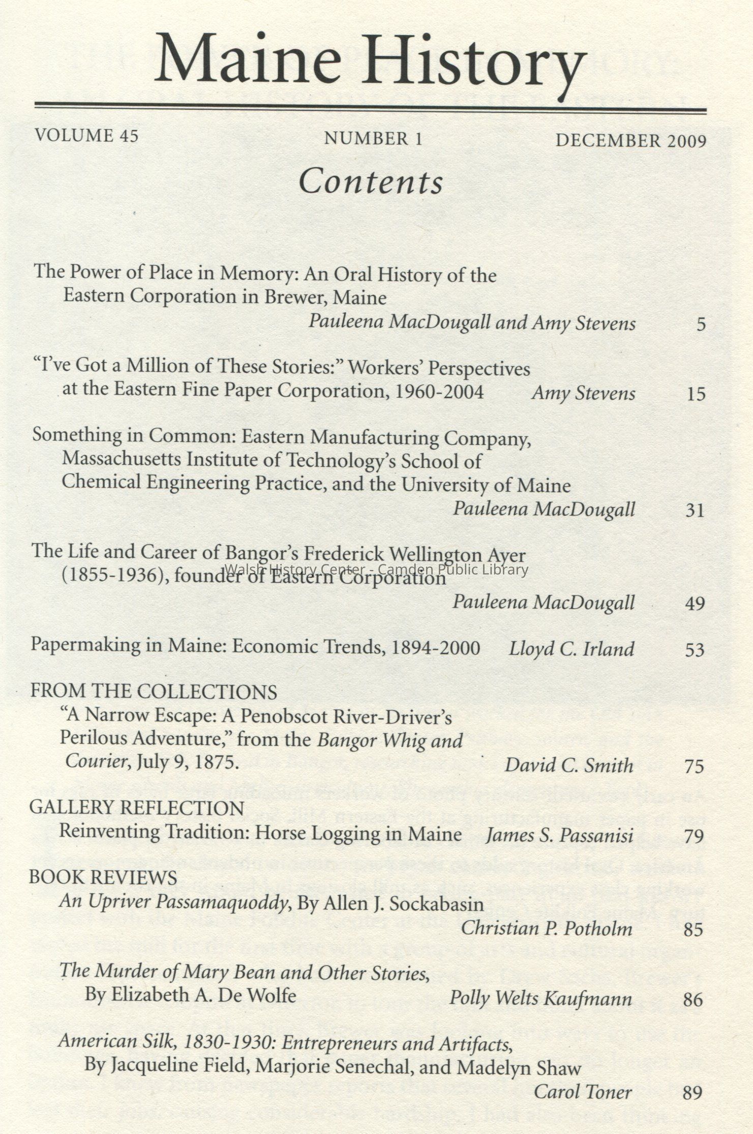 Maine History, published quarterly by the Maine Historical Society, Volume 45, December 2009. Issue focuses primarily on papermaking industry.
