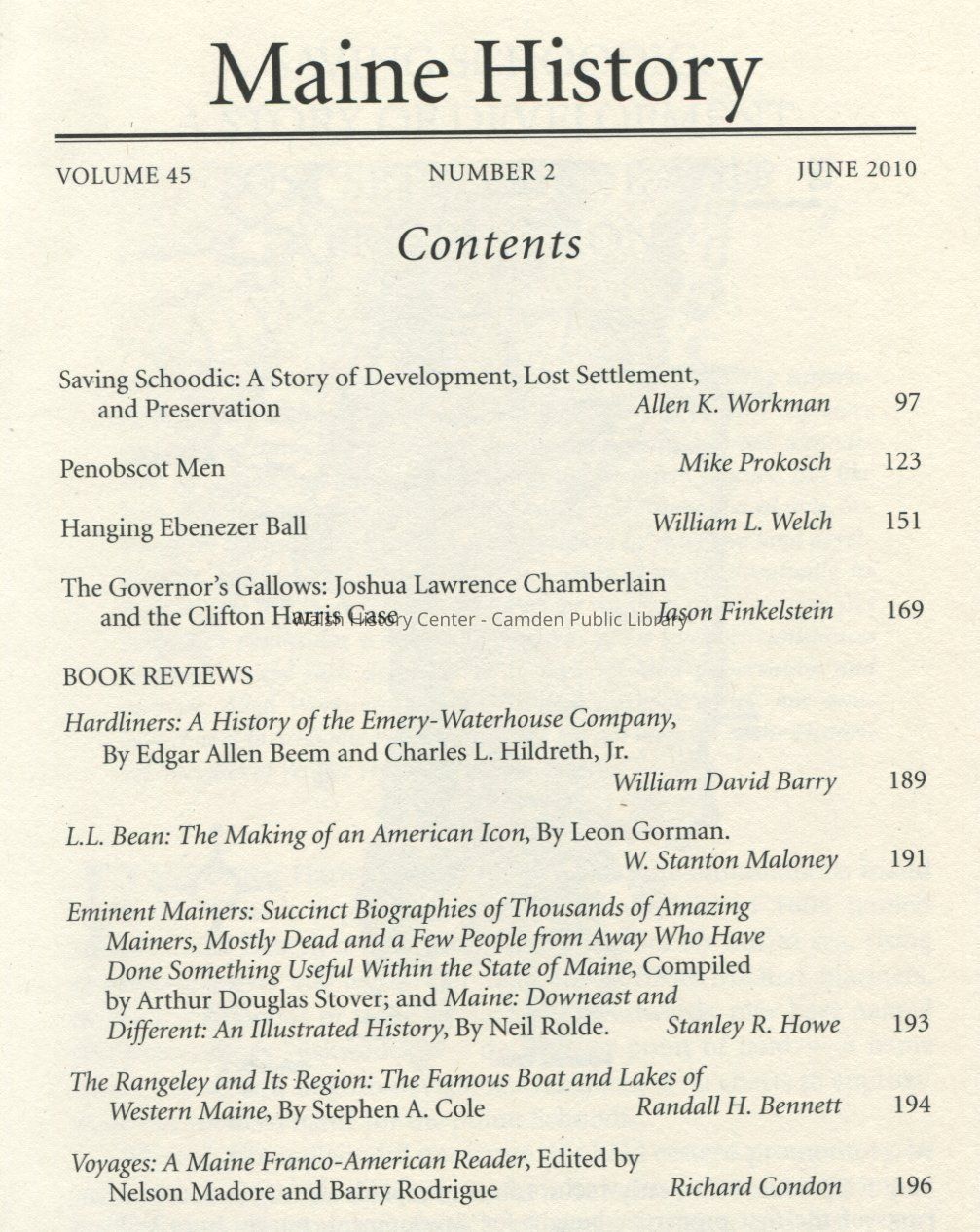 Maine History, published quarterly by the Maine Historical Society, Volume 45, June 2010.