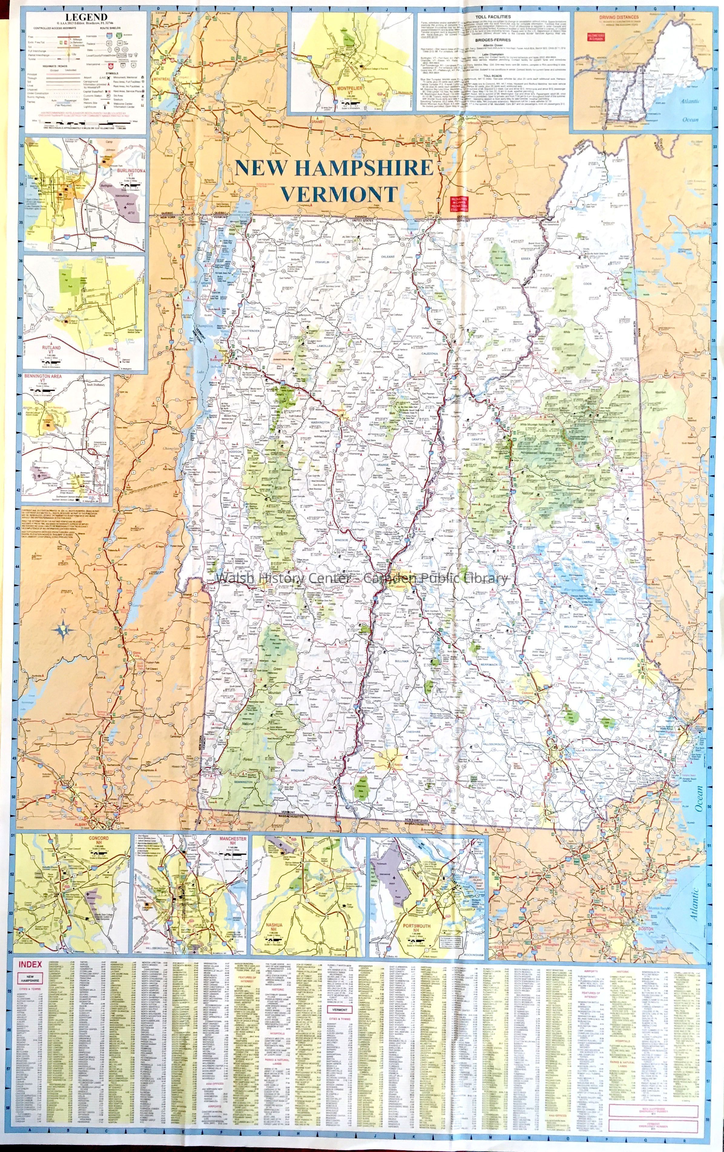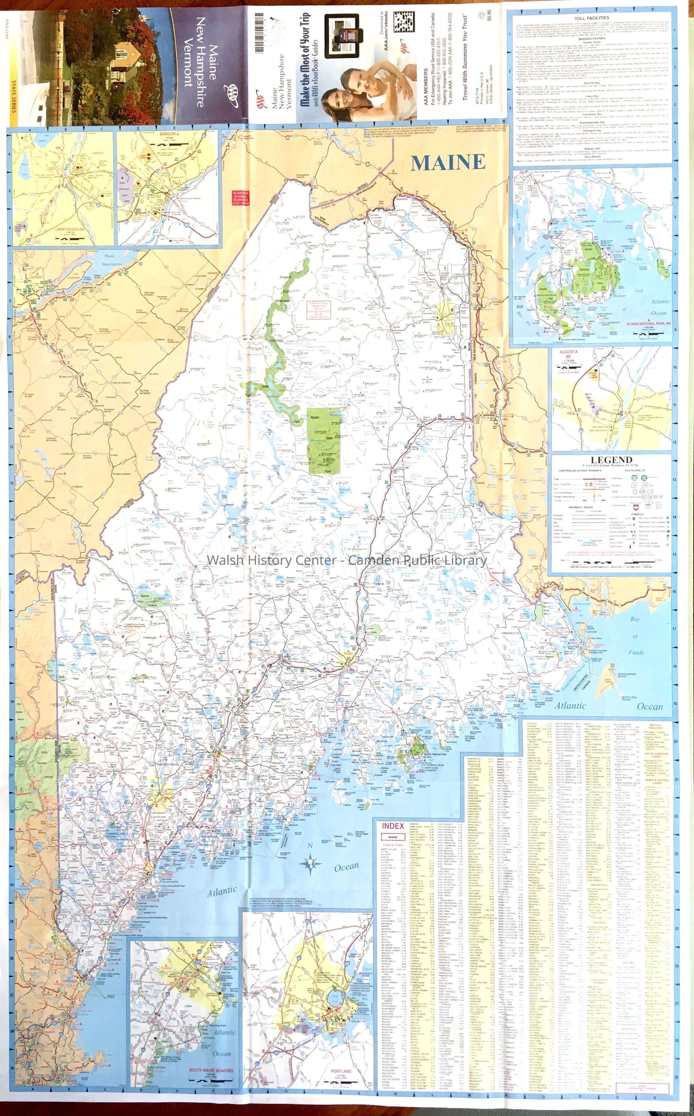 MAINE-NEW HAMPSHIRE - VERMONT American Automobile Association (AAA) State Series map. Note the cover of this map, when folded, shows the Camden Public Library. Maine is shown on one side at approx. one inch = eleven miles, New Hampshire and Vermont are shown on the other side at a scale of approx.. 8 miles.
