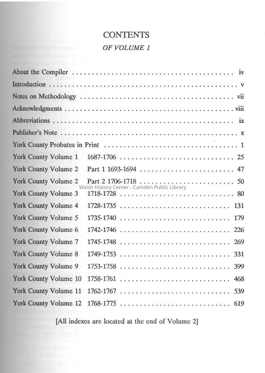 A collection comprised of abstracts of all records of the Probate Courts of Maine, whether wills, administrations, estate division, estate accounts, guardianships or other acts. In addition, the author notes four separate publications where early Maine estate papers and records are in print. This collection capsulizes the four publications themselves as they survived and are indexed. Note that records listed in the first three publications are noted in this collection, but not abstracted. Additional records of Maine probate are in Suffolk County, Massachusetts during the period of 1686-1692. The work is arranged by volume notation, item number, name of person with residence, title of act and folio number, file number, and abstract. A notation of methodology for dating of inventories, spelling of names, and sources is also listed. This volume includes York County Volumes 1-12, covering the years 1687-1775.