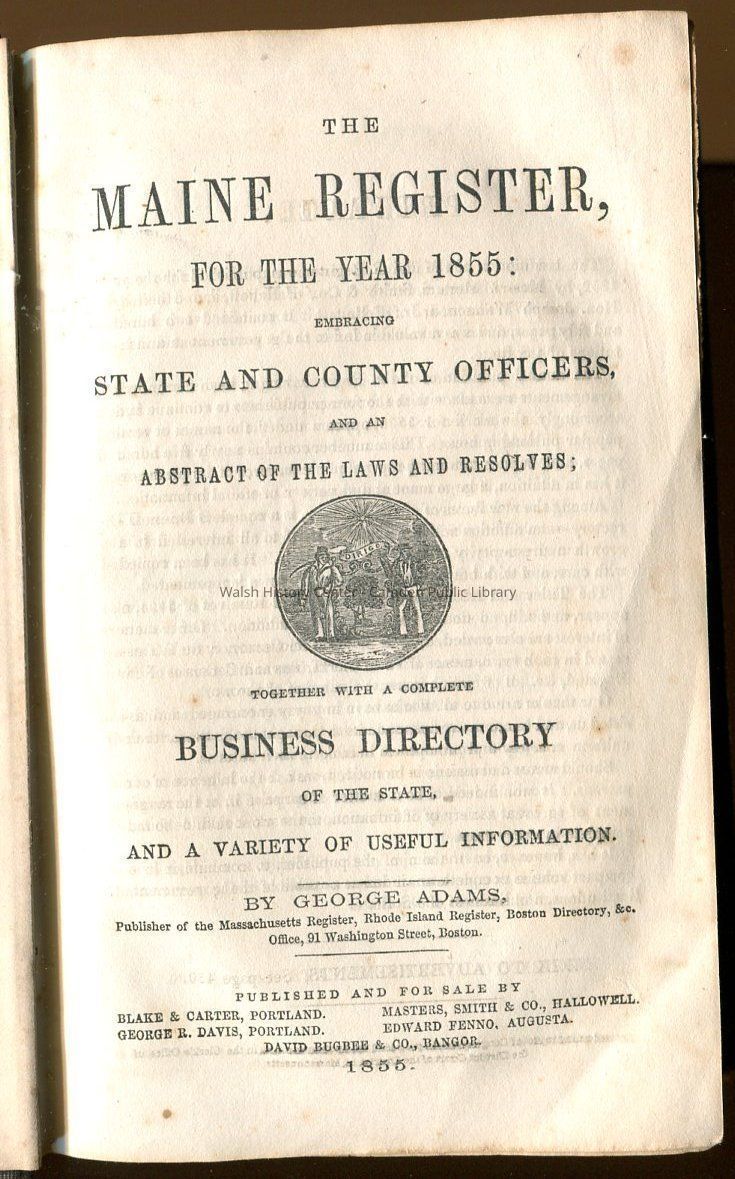 Maine register for 1855 together with a complete business directory of Maine. Includes titles and abstracts of the laws and resolves of 1854, taxes assessed in each town, names of county and town officials, population of each county, lists of physicians, lawyers, and milita members, schools, charities and agricultural societies.