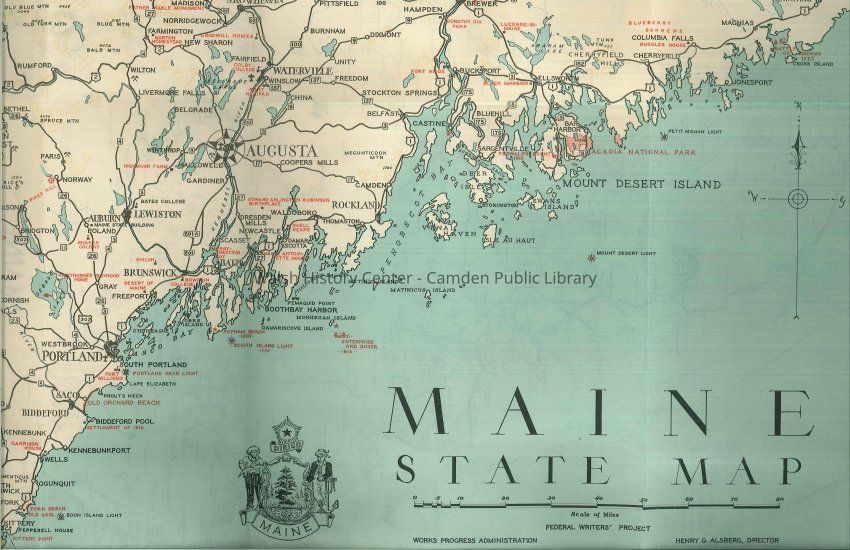 Maine state map, 1937, by the Federal Writer's Project of the Works Progress Administration. Maine transportation map and recreation map on verso. Index to points of interest, cities, and towns.Collection