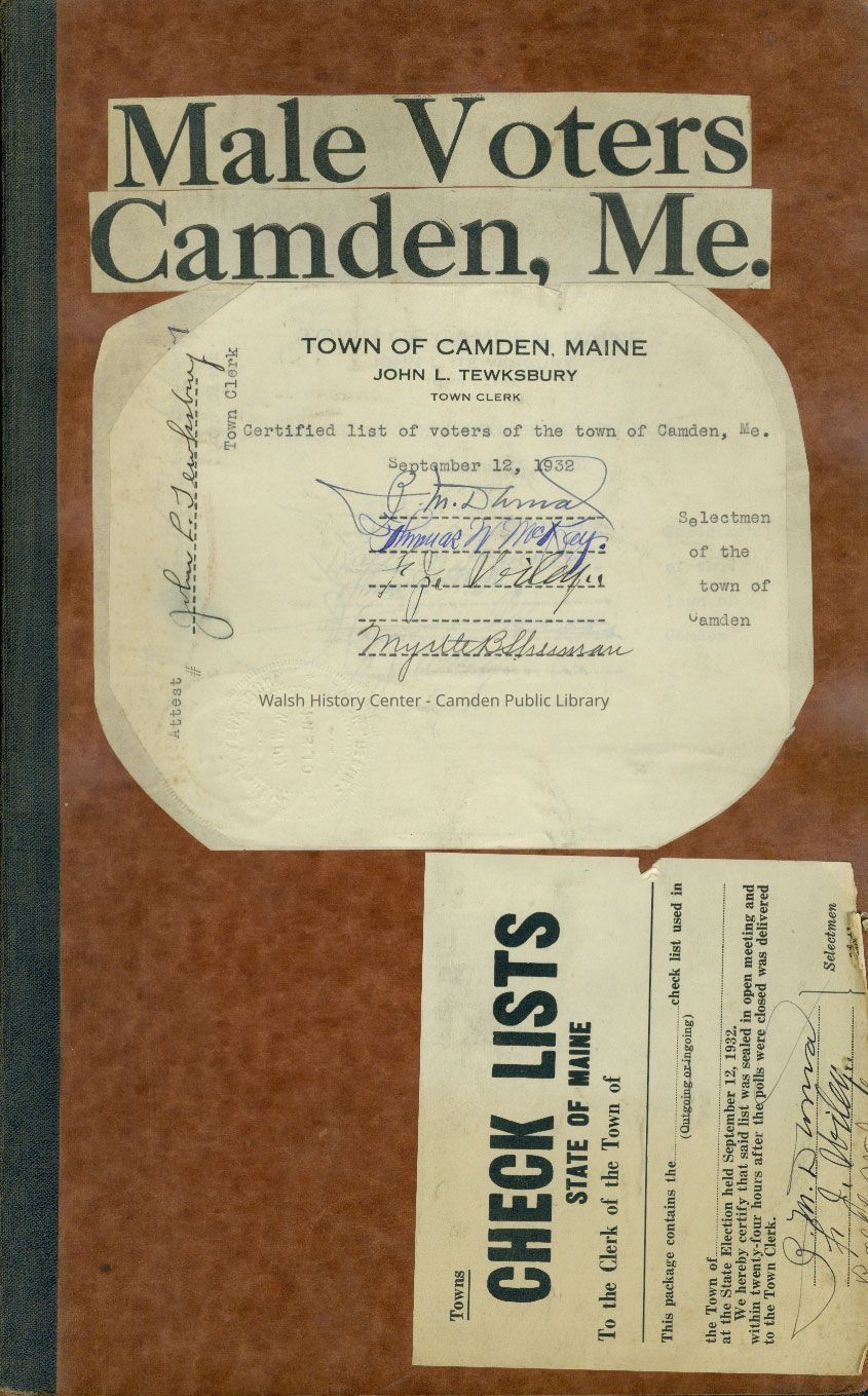 Town of Camden certified list of male voters as of September 12, 1932. Signed by the Selectmen of the Town of Camden and the Town Clerk. Also includes certified embossed seal of John L. Tewksbury.Collection