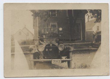 View of an automobile parked in front of a house. The car's license plate reads 220-J, with the word "Maine" visible on the left and the year on the right. Likely a dealer plate from the early to mid-1920's. A man is seated in the driver's seat. There is a house in the background.Collection