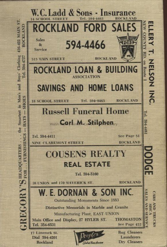 Directory for Rockland, Camden, and Rockport, 1967. Includes alphabetical listing of individuals, streets, and businesses (businesses also listed by type). Contains directory information on city government, town government, societies, churches, schools, and post offices. Includes advertisements.