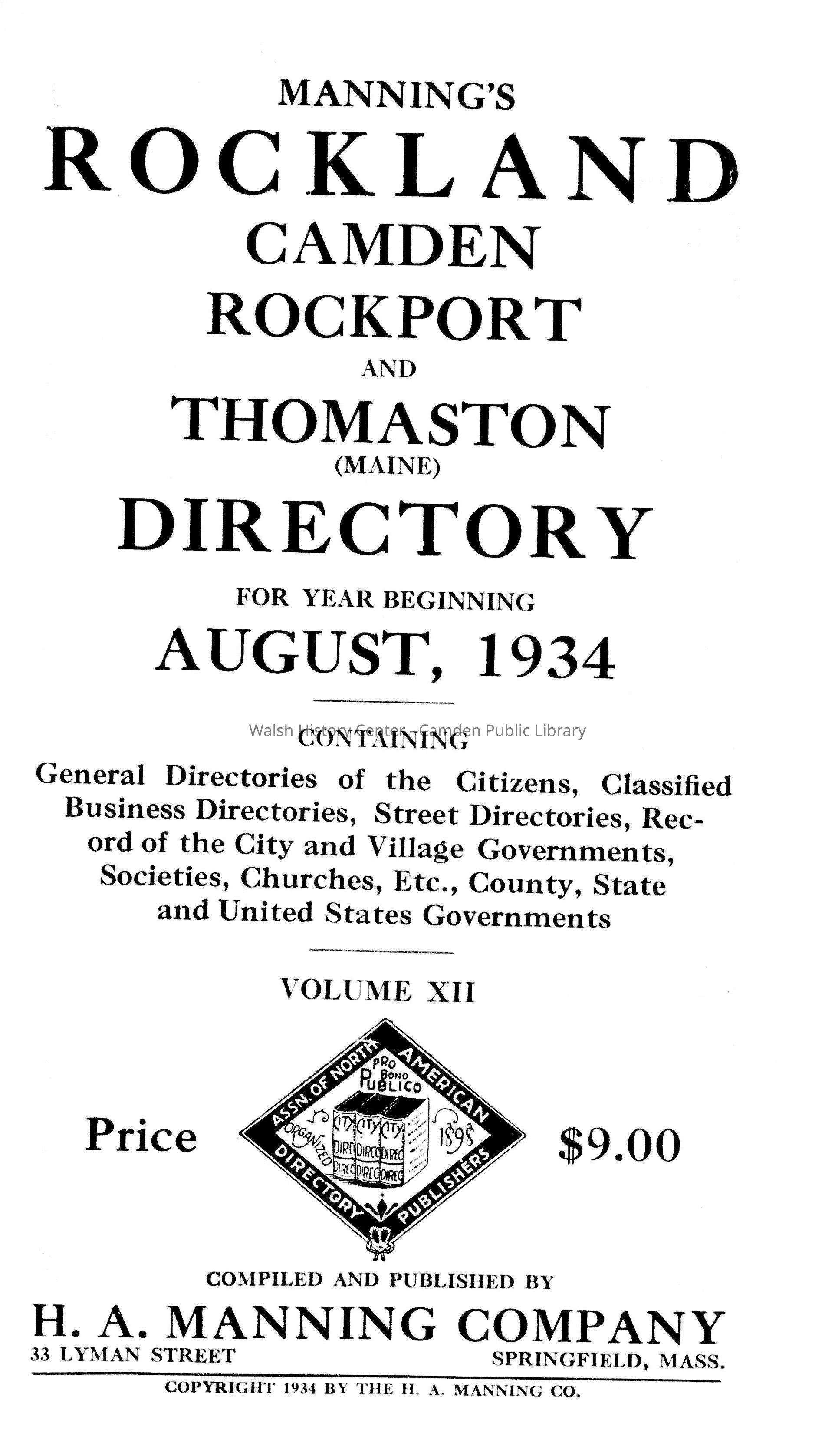 Manning's Rockland, Camden, Rockport, and Thomaston, Maine Directory for Year Beginning August 1934Entry/Object ID