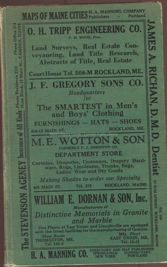 Directory for Rockland, Camden, Rockport and Thomaston, 1934. Contains alphabetical directories for individuals, classified business directories, street directory, town governments, state government, schools, post offices, police departments, courts, fire departments. Full-page advertisements. Fold-out map of Rockland attached to back cover.