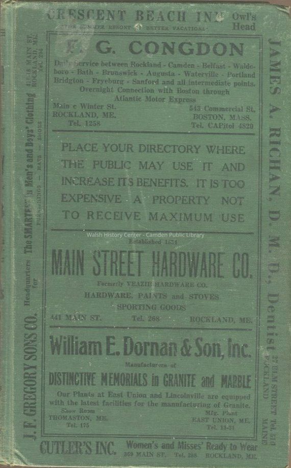 Directory for Rockland, Camden, Rockport, Thomaston, South Thomaston, and St. George, 1938. Contains alphabetical directories for individuals, classified business directories, street directory, town governments, state government, schools, post offices, police departments, courts, fire departments. Full-page advertisements. Fold-out map of Rockland attached to back cover.