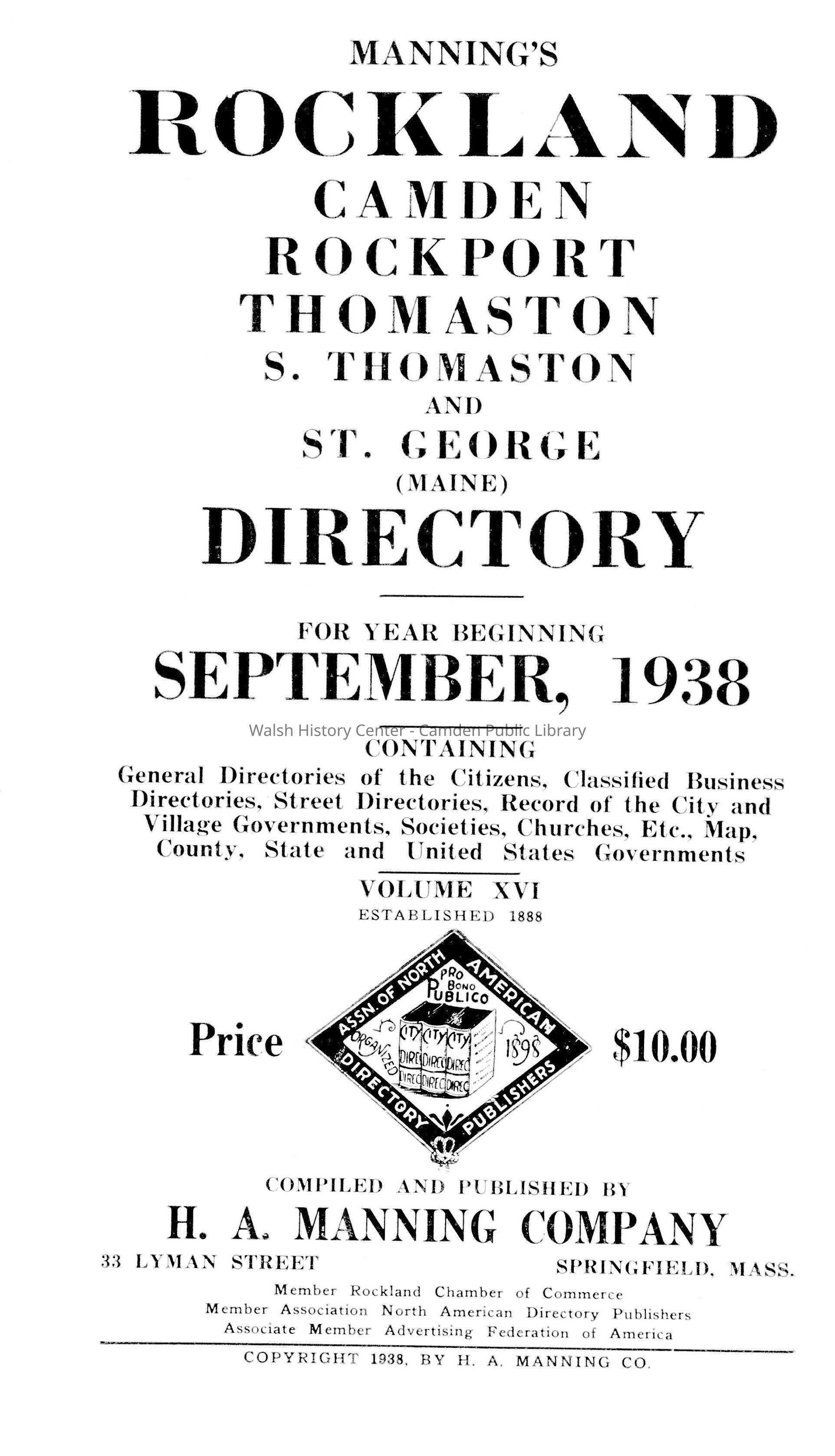 Manning's Rockland, Camden, Rockport, Thomaston, South Thomaston, and St. George, Maine Directory for Year Beginning September, 1938.Entry/Object ID