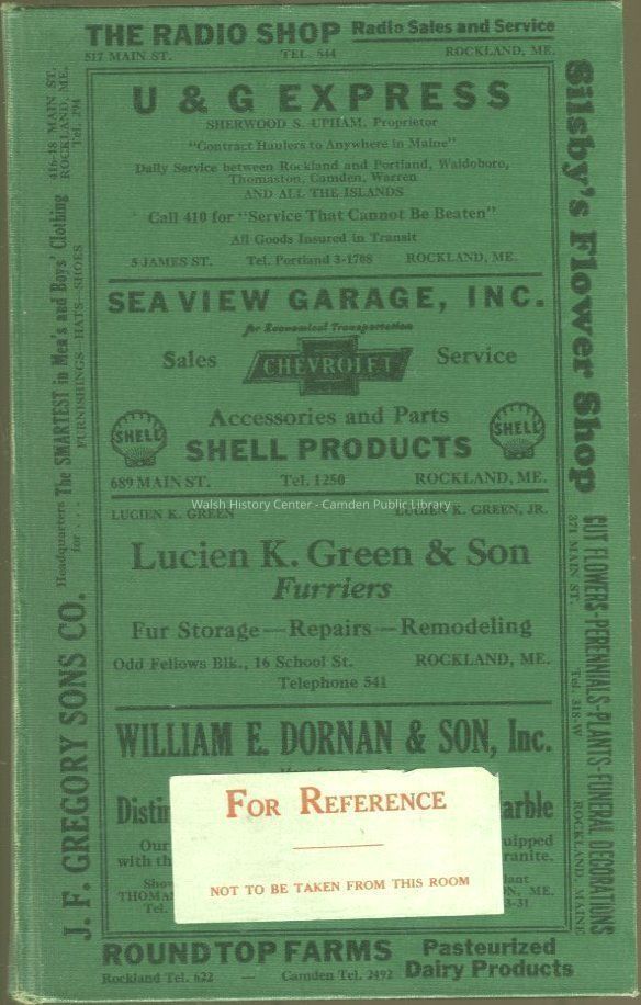 Directory for Rockland, Camden, Rockport, Thomaston, Union, and Warren, 1942. Contains alphabetical directories for individuals, classified business directories, street directory, town governments, state government, schools, post offices, police departments, courts, fire departments. Full-page advertisements.