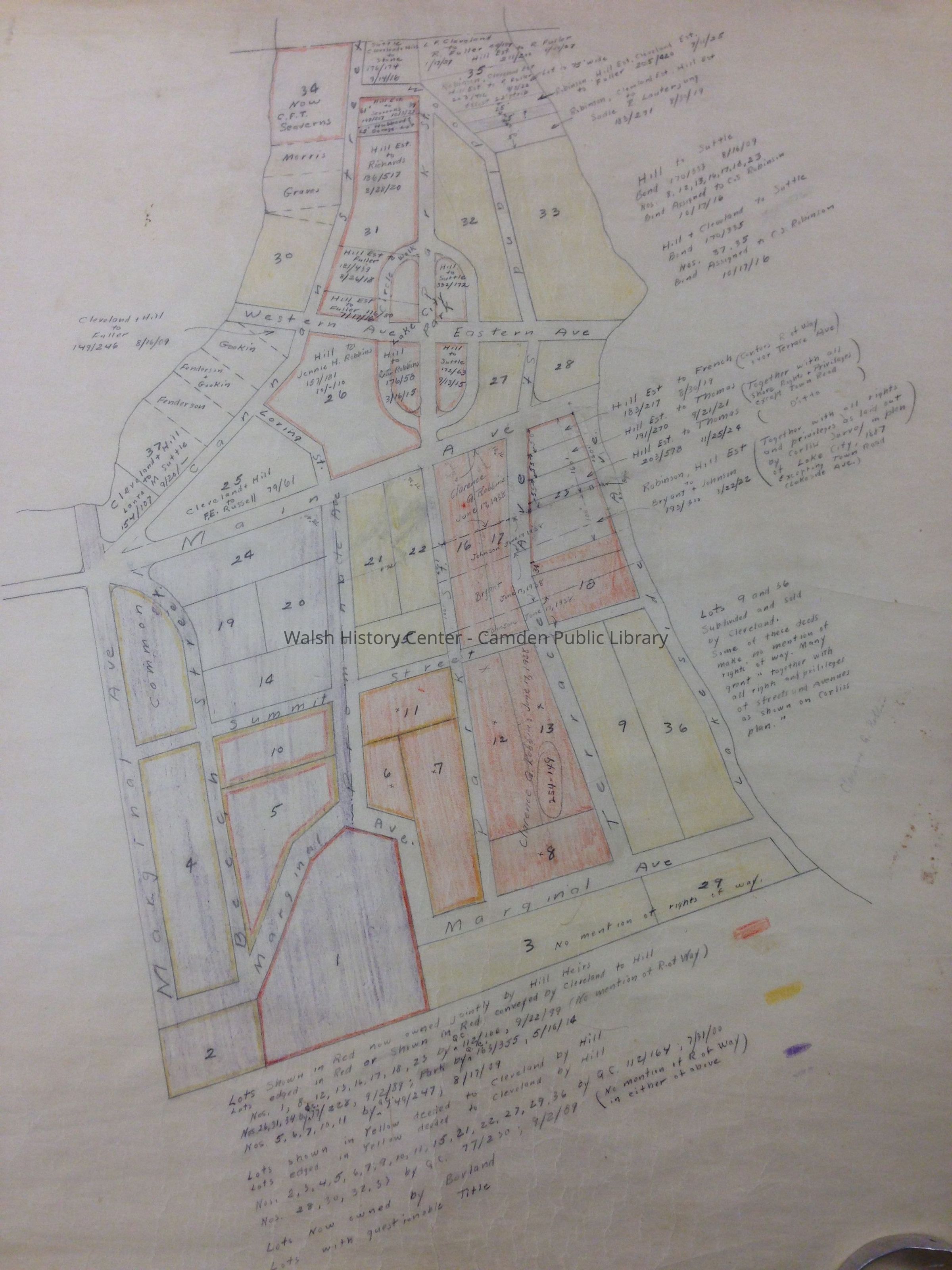 Hand-drawn map of Lake City lots bounded on two sides by Lakeside Avenue and Marginal Avenue. Map is undated and creator is unknown. No scale noted. Colored shadings on map indicate lots owned by Cleveland, Hill, and Borland heirs.Collection