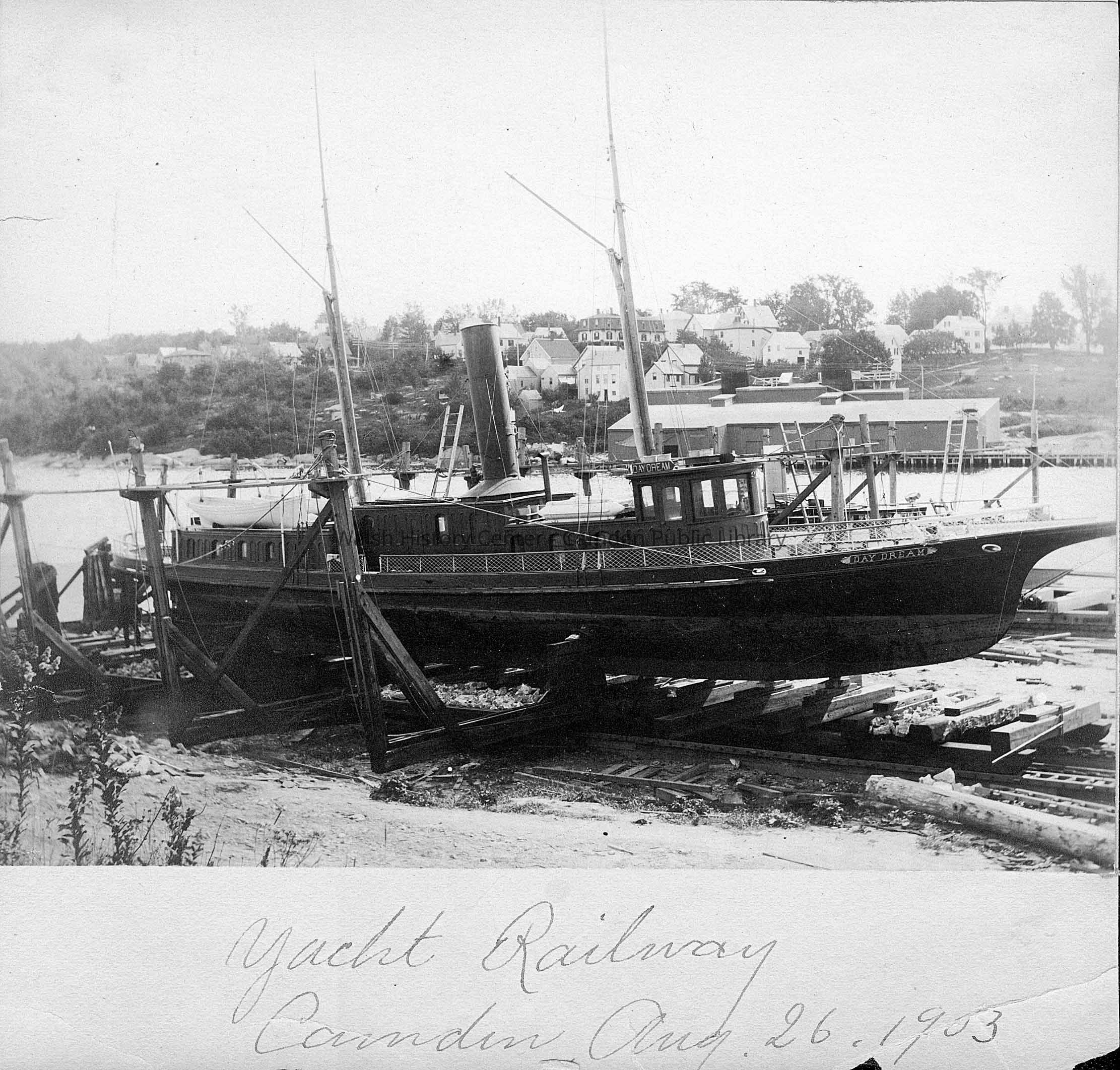 Original photograph of Camden Harbor taken August 26, 1903 featuring the Yacht Railway.Collection