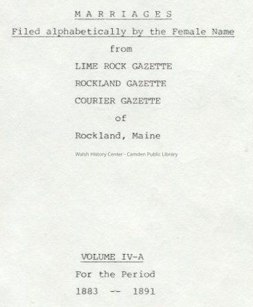 Marriage records transcribed from the original newspapers at the office of the Courier Gazette in Rockland, Maine by Ruth and Charles Candage. Volume IV-A covers the period 1883-1891. Marriages in this volume are filed by the female name. Volume IV-B covers the period from 1883-1891. Marriages in this volume are filed by the male name.