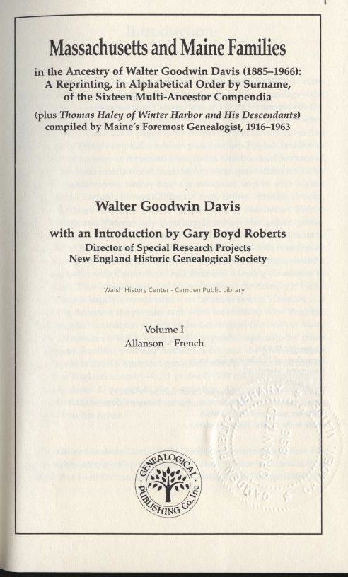 Massachusetts and Maine Families in the Ancestry of Walter Goodwin Davis (1885 - 1966)Entry/Object ID