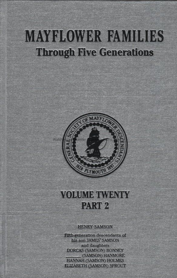 Volume 20, Part 2 of the Mayflower Families Through Five Generations series. This final volume of two records the descendants of Henry Samson and his wife Ann Plummer through son James and daughters Dorcas Bonney, ? Hanmore, Hannah Holmes, and Elizabeth Sprout.