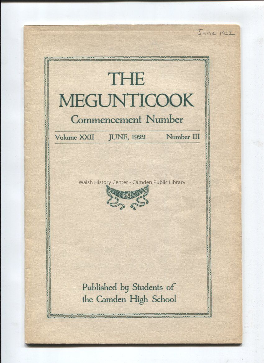 Camden High School publication. June 1922. Vol 22, Number 3. Includes advertisers, editorials, student articles, and photo of the graduating class. Graduation exercises program included in the front cover.