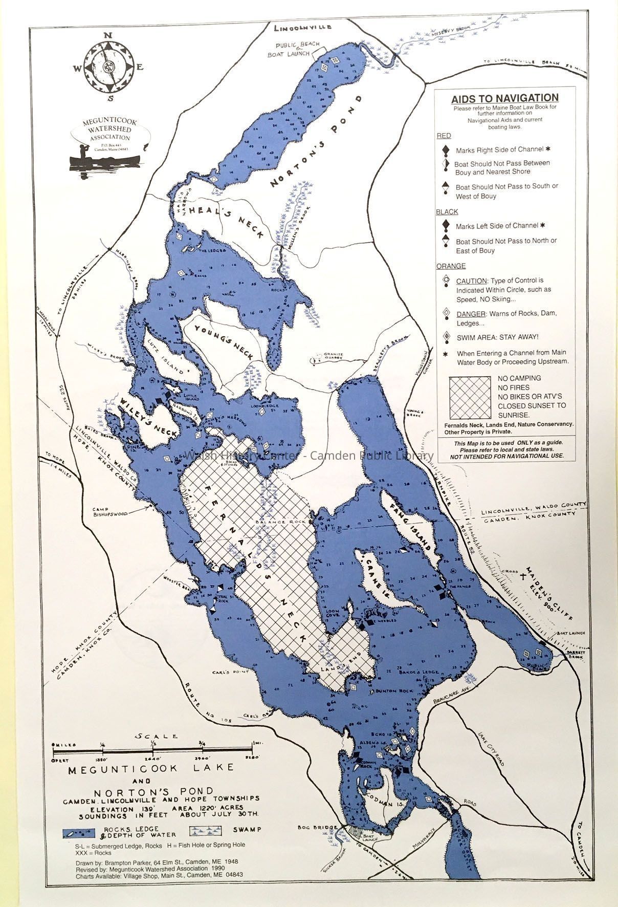 Megunticook Lake and Norton's Pond, by Brampton Parker, 1948; revised by Megunticook Watershed Association, 1990. Scale of miles, shows water features, roads, political boundaries; with a key to features. Depth of water is shown in feet as of the usual end of July. Two-color map (blue and black)Collection