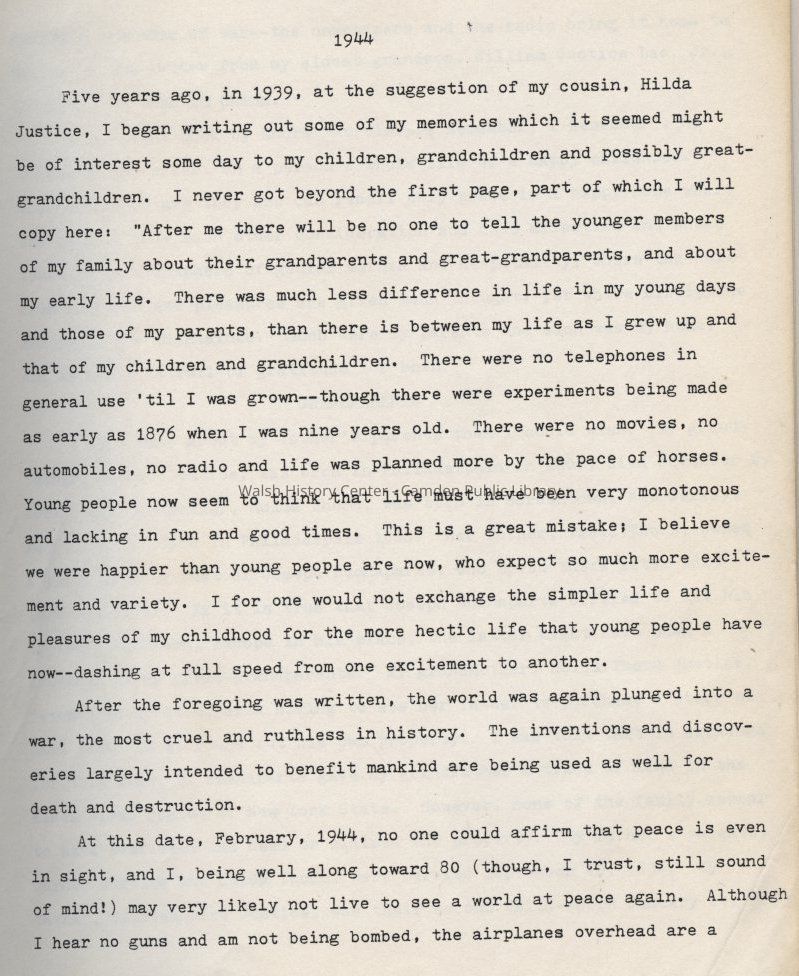 Personal memoir of Mary Justice Chase of Blueberry Farm, Melvin Heights, Camden, Maine with family connections to Philadelphia, Pennsylvania and the Quakers.