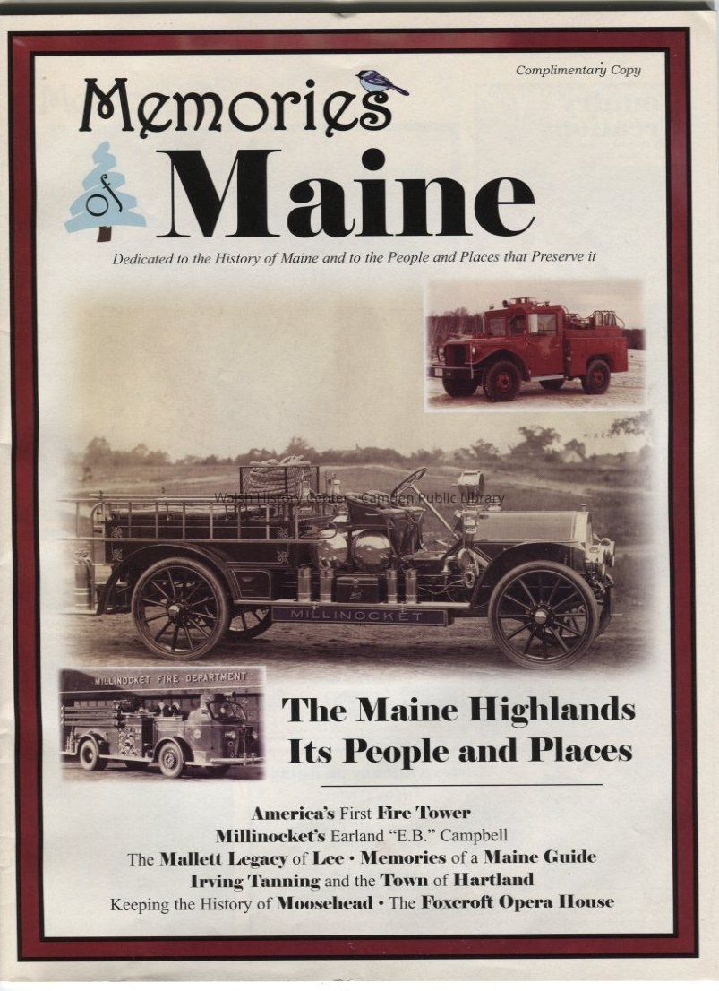 Includes articles on memories of a Maine guide, the fire tower on Big Squaw Mountain, the Moosehead Historical Museum, the Monson Cornet Band, the Foxcroft Opera House, Irving Tanning Company and the town of Hartland, stenciling, logging camp kitchens, origin of the Town of Lee, and Earland "E.B." Campbell, Millinocket's snowmobile pioneer and his induction into the National Snowmobile Hall of Fame.