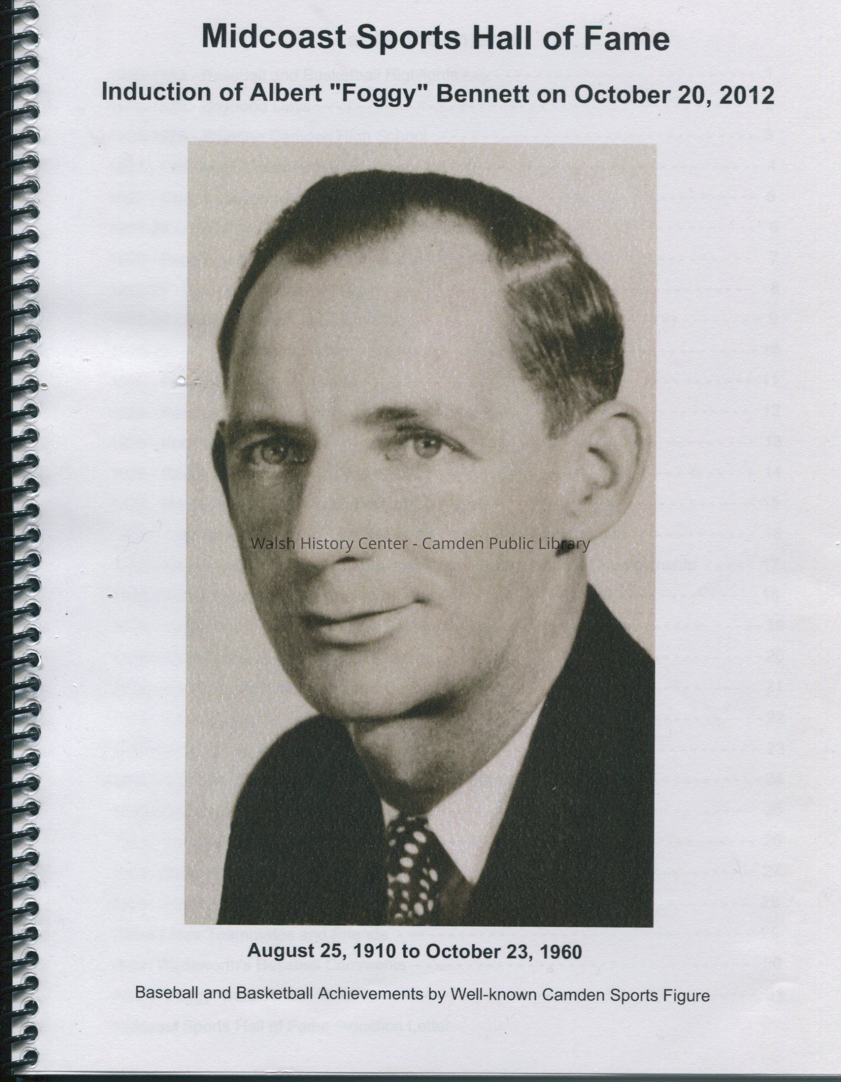 Spiral-bound biographical sketch of Albert "Foggy" Bennett (25 August 1910 - 23 October 1960) by his son Albert Bennett, Jr. on the occassion of Albert's induction into the Midcoast Sports Hall of Fame. Albert "Foggy" Bennett was a well-known baseball and basketball player from Camden, Maine.
