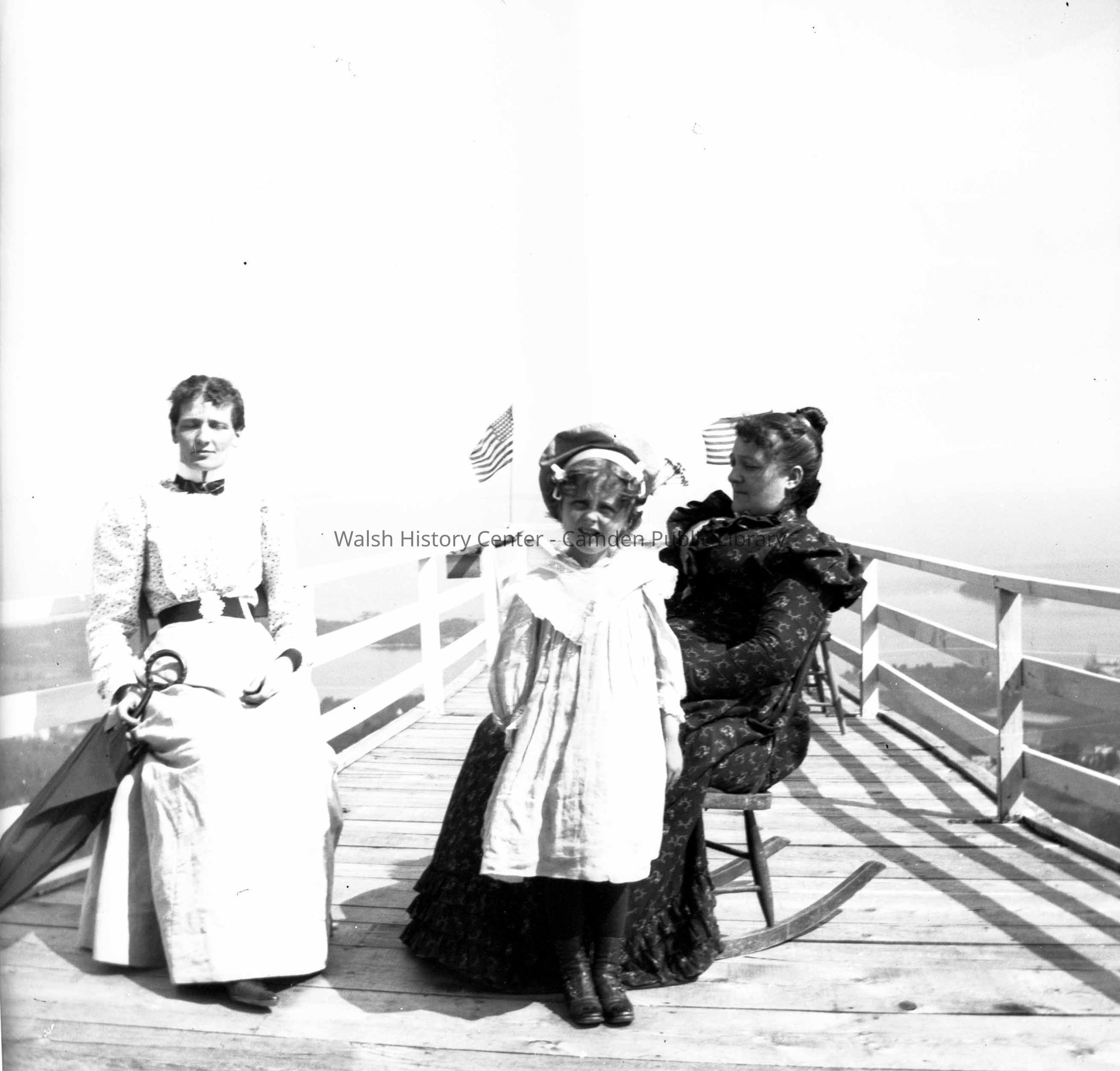 B/W photo of Minnie Babb, young Margaret, and Emma Babb (seated) at the Summit House on Mt. Battie on July 8, 1898.Collection
