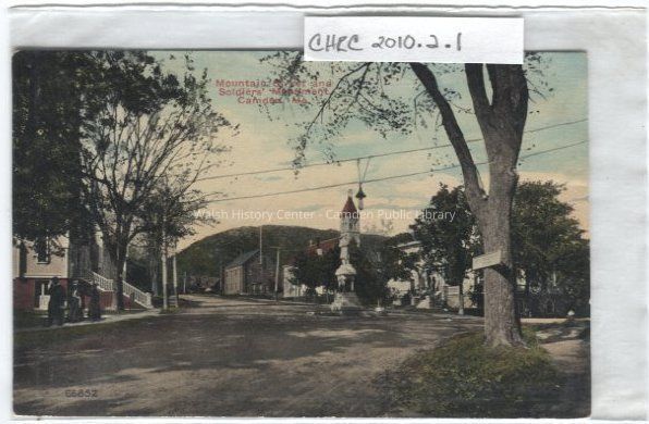 Colored postcard of Mountain Street and the Soldier's Monument. Also shows the Episcopal Church.Collection