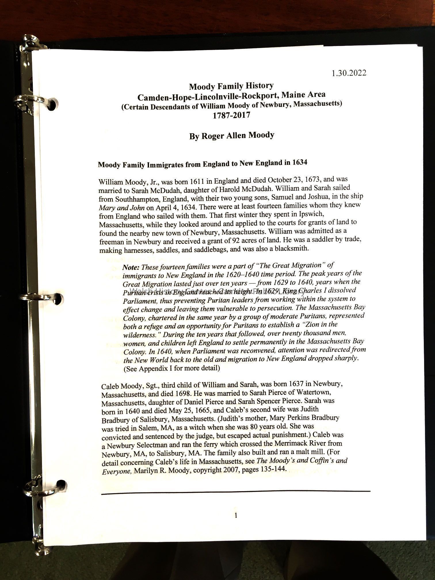 Title Moody Family History : Camden-Hope-Lincolnville-Rockport, Maine area (certain descendants of William Moody of Newbury, Massachusetts) 1787-2017 / by Roger Allen Moody.