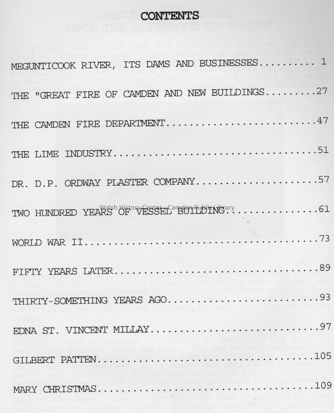 History of the Camden area by local historian. Includes articles on Megunticook River, dams, 1892 fire, Camden Fire Department, lime industry, Ordway Plaster Company, shipbuilding, World War II, Edna St. Vincent Millay, and Gilbert Patten.