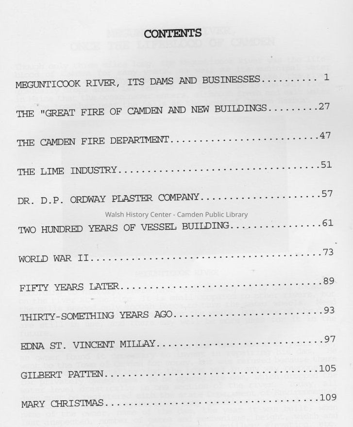 "George W. Wells", "Pine Tree #1", Batchelder Privilege, Brewster's Annex, Brewster's Shirt Factory, Camden, Camden Anchor - Rockland Machine Co., Camden Community Hospital, Camden Fire Department, Camden Honor Roll, Camden Opera House, Camden Shipbuilding and Marine Railway Yard, Camden Tanning Corporation, Knowlton Brothers, Knox engines, Knox Woolen Company, Lime Industry, Masonic Temple, Megunticook River, Molyneaux dam, Mt. Battie Mill, Ordway Plaster Company, Seabright Mill, Seabright Woven Felt Company, Whitehall Inn, World War II