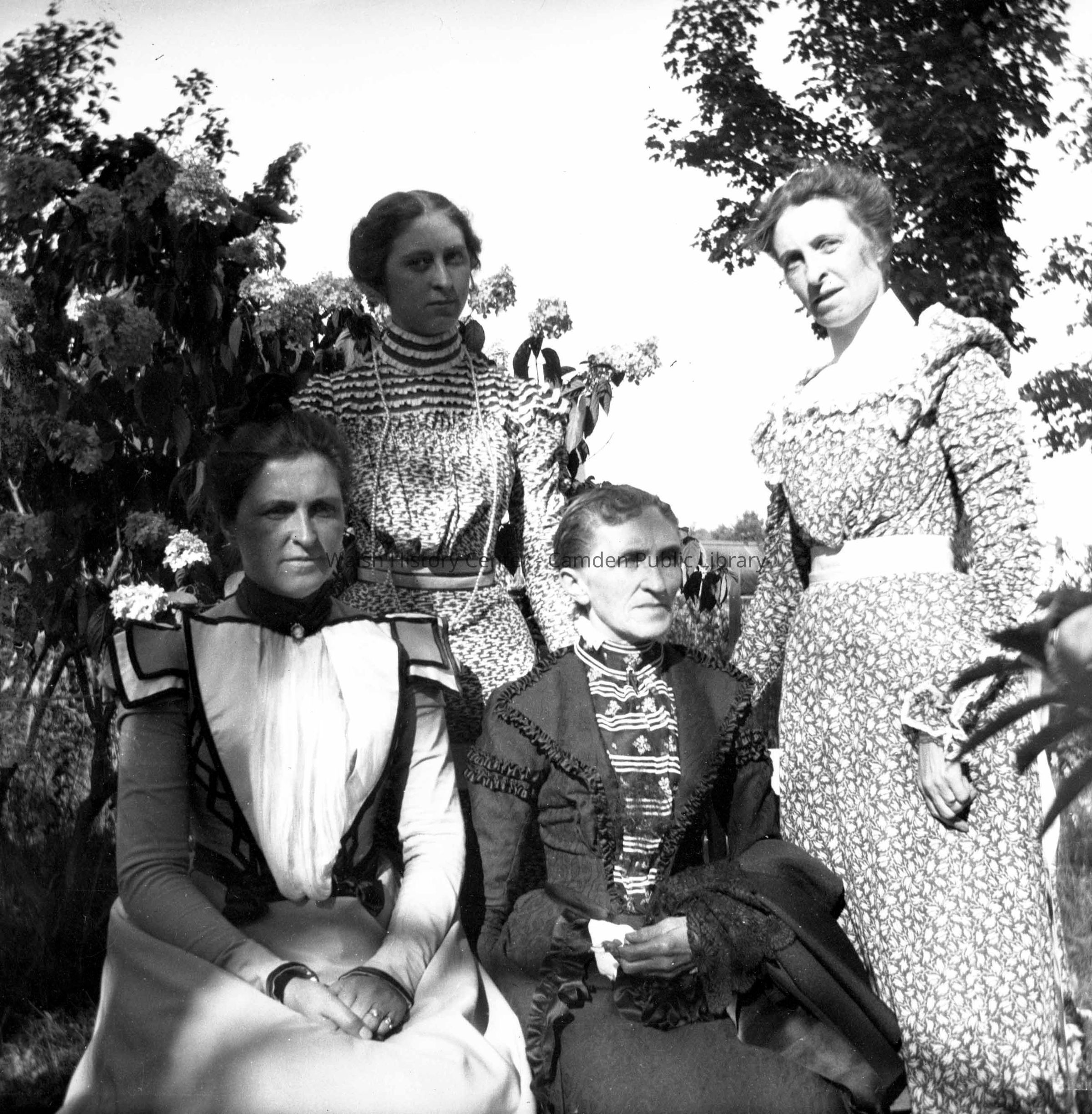 Black & white photo of 4 women and labeled "Mothers & Daughters, September 1899." The elderly woman is probably Mrs. Parker with her daughters Grace and Theresa, with another woman known as Bess (could be Alice Merriam).Collection