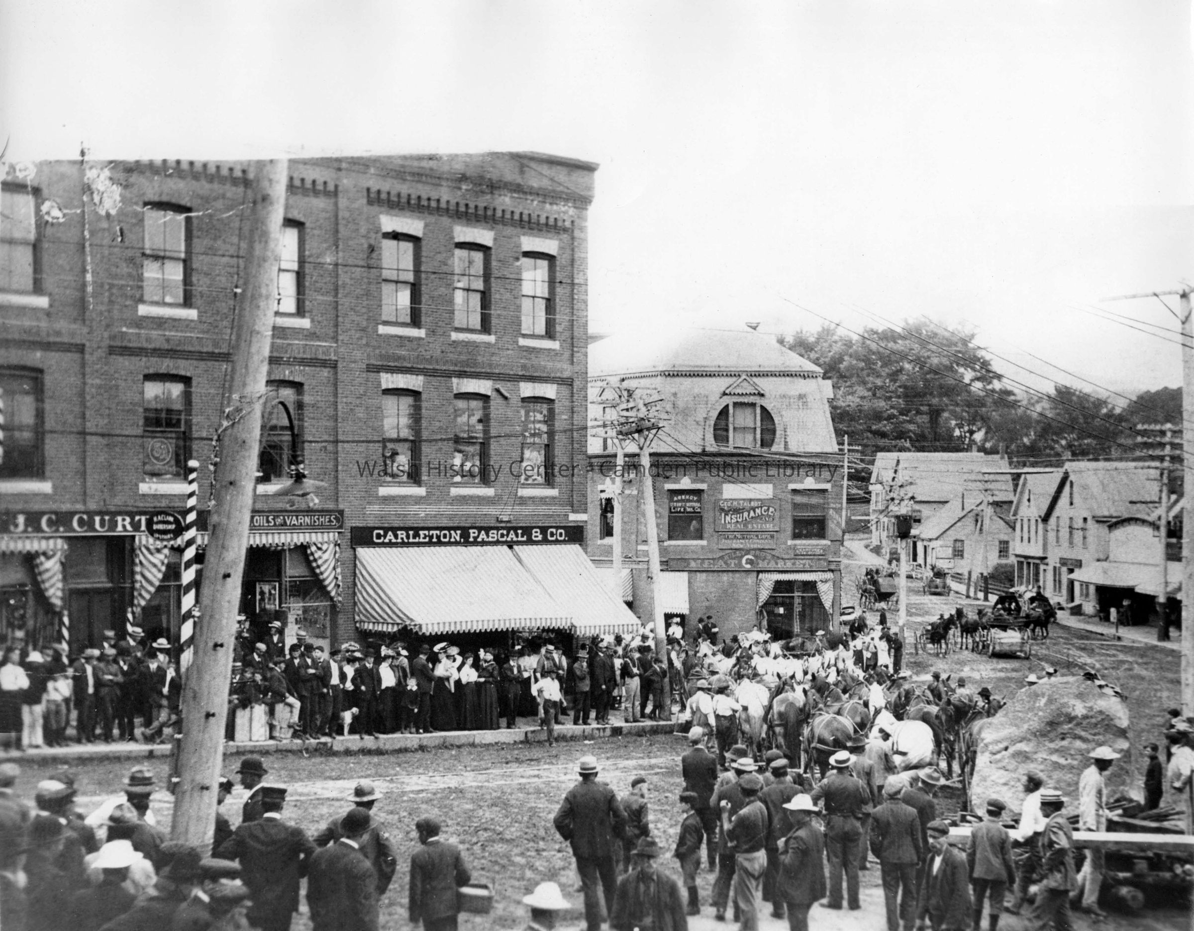 Copy of photo of Main and Elm Streets in Camden depicting several teams of horses pulling the Conway memorial boulder through town with crowds of people gathered to watch.Collection